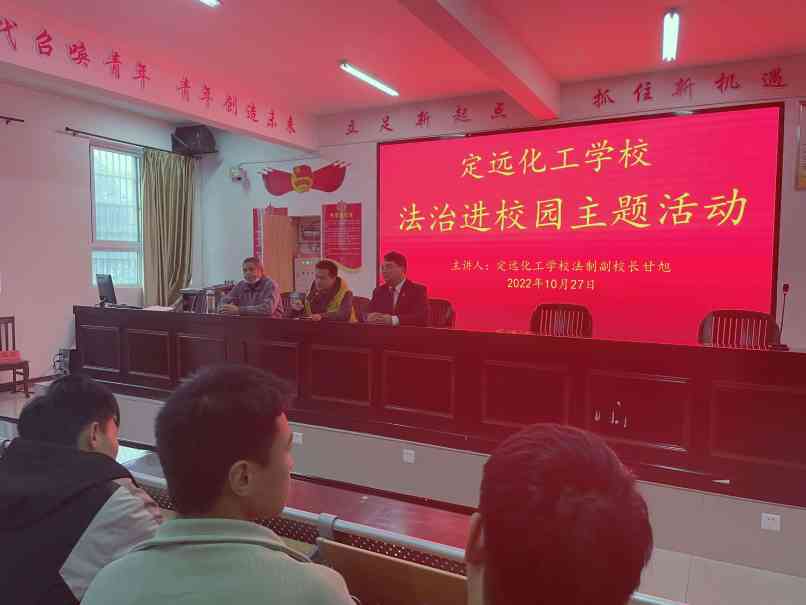 ~ 10月27日,定远化工学校在综合楼一楼会议室开展法治进校园主题活动。定远县人民法院法官、定远化工学校法制副校长甘旭,校党委委员王家欢,安全办主任范鹏举出席活动,各班学生代表参加了本次活动。王家欢主持活动并作主题发言,他阐述了本次活动的意义和法治进校园的重要作用,特别要求与会学生代表要认真学习,并把学习重点向班级同学转达。