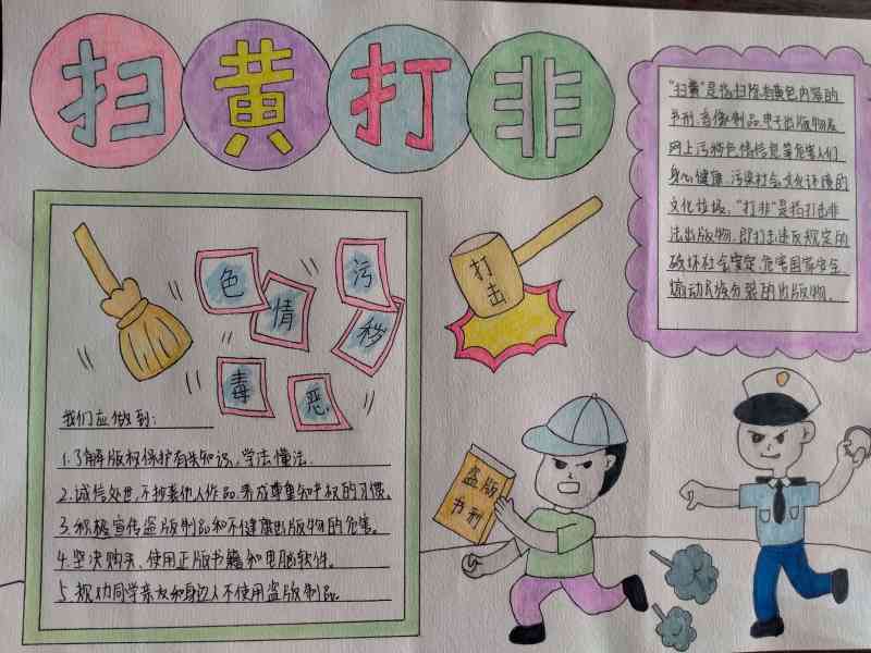 ~ 活动中,该校通过电子显示屏、展板、微信群、悬挂横幅等方式进行积极宣传。该校少先队组织高年级各班围绕“扫黄打非”这一主题精心创作了内容新颖、美观大方、版面整洁的精美手抄报。同学们在其中阐述了“扫黄打非”的具体含义、非法出版物的危害、青少年应该怎样做等内容。少先大队的负责同志为获奖的同学颁发了奖状和奖品。