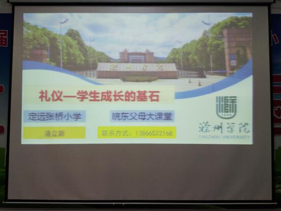 本次活动邀请了滁州学院硕士生导师、礼仪培训中心主任潘立新教授为与会人员作了题为《礼仪——学生成长的基石》的专题讲座。潘教授通过故事分析、案例讲解、现场问答、互动交流、躬身示范等方式与师生、家长们进行了一场面对面的心灵的交流。他引导老师、家长要多关注孩子的身心健康、重视培养孩子的礼仪素质、仪表仪态、留意孩子待人接物的方式,规范学生的日常用语等。潘教授形象生动的语言和讲授内容的实用性、可操作性,令现场气氛热烈,掌声不断。会后,个别家长还主动向潘教授咨询有关孩子的教育方式方法。
