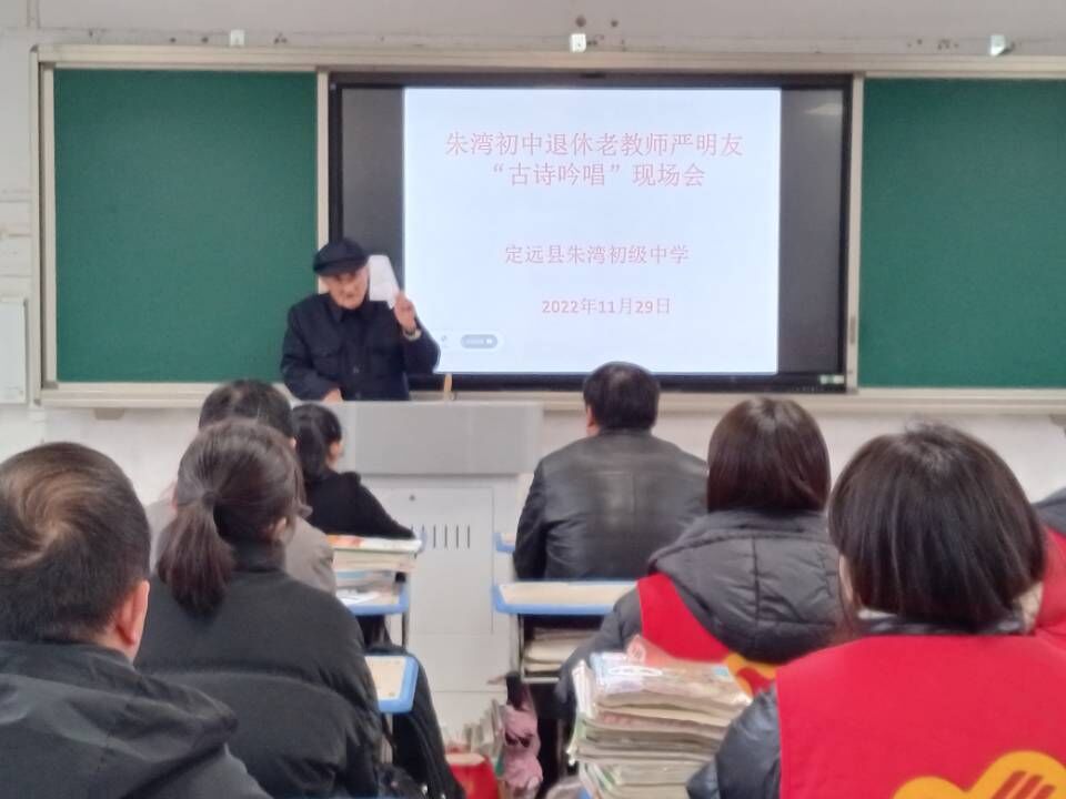 ~ “熟读唐诗三百首,不会作诗也会吟”。古诗词是我国古典文化的精华,精炼的语言,深刻的寓意,和谐的音韵,千百年来广为传诵,成为我们取之不尽、用之不竭的宝贵财富。11月29日,定远县朱湾初中退休教师严明友为全体教师和部分学生表演了一场别开生面的古诗词吟唱。带领我们一起走进古诗词的世界,尽情享受古诗词的魅力。严老师声情并茂、抑扬顿挫的吟唱,让在座师生沉浸在中华经典的千古风韵里,沉浸在底蕴深厚的传统文化中……一首经典的古诗词《月夜》演唱和教学,将诗词与音乐融为一体,一起绽放千年古诗词的力量。