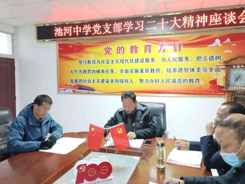 ~ 2022年11月30日,定远县池河中学党支部在学校行政楼会议室开展学习党的二十大精神座谈主题党日活动。校党支部书记欧健海主持会议并讲话,全体在职党员参加会议。