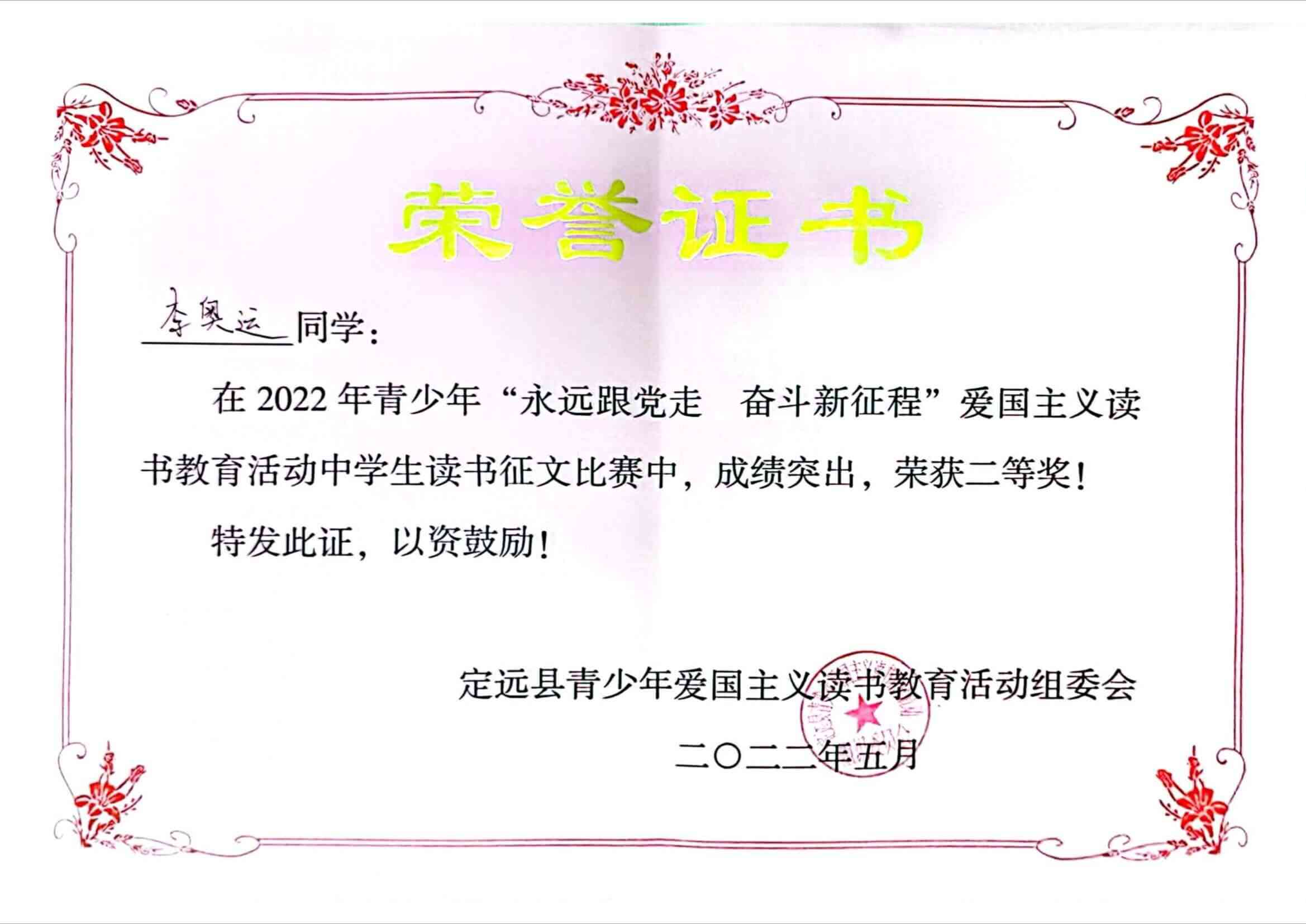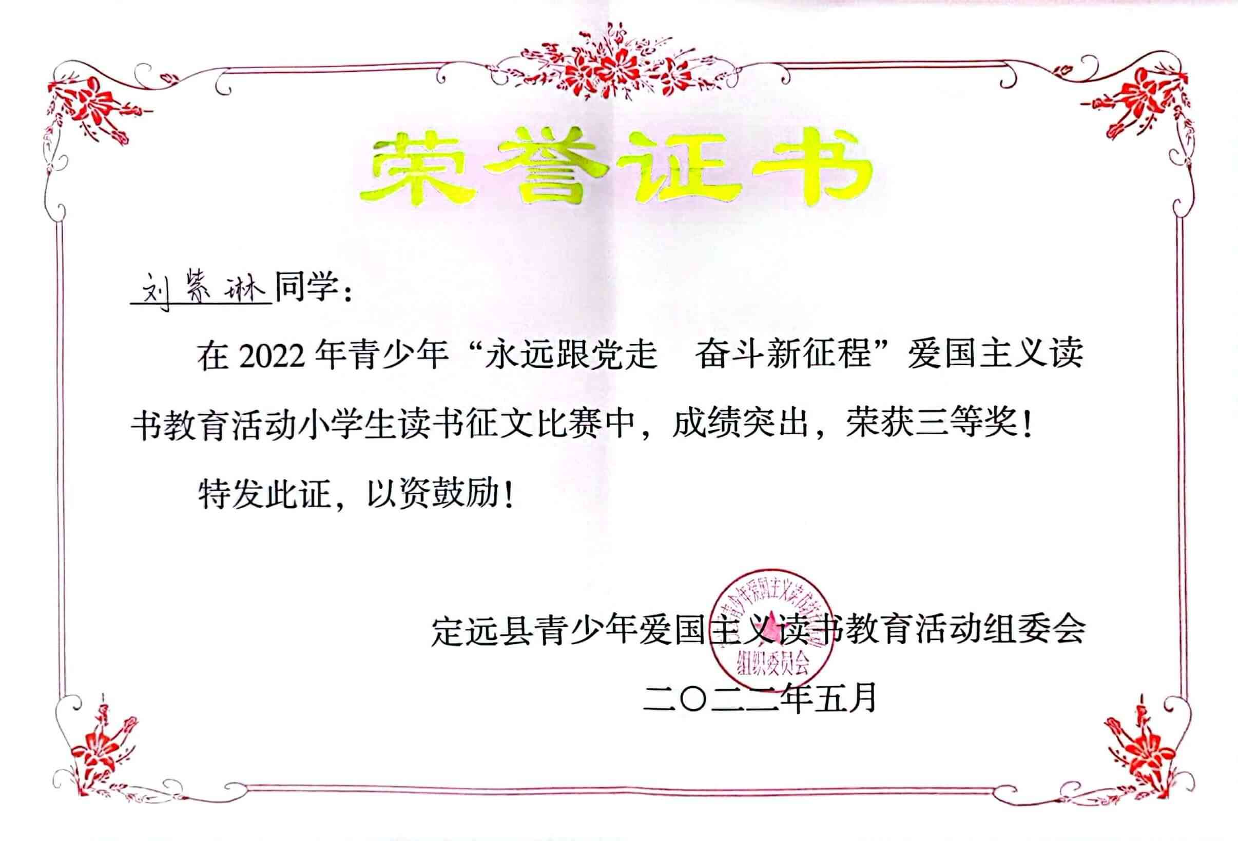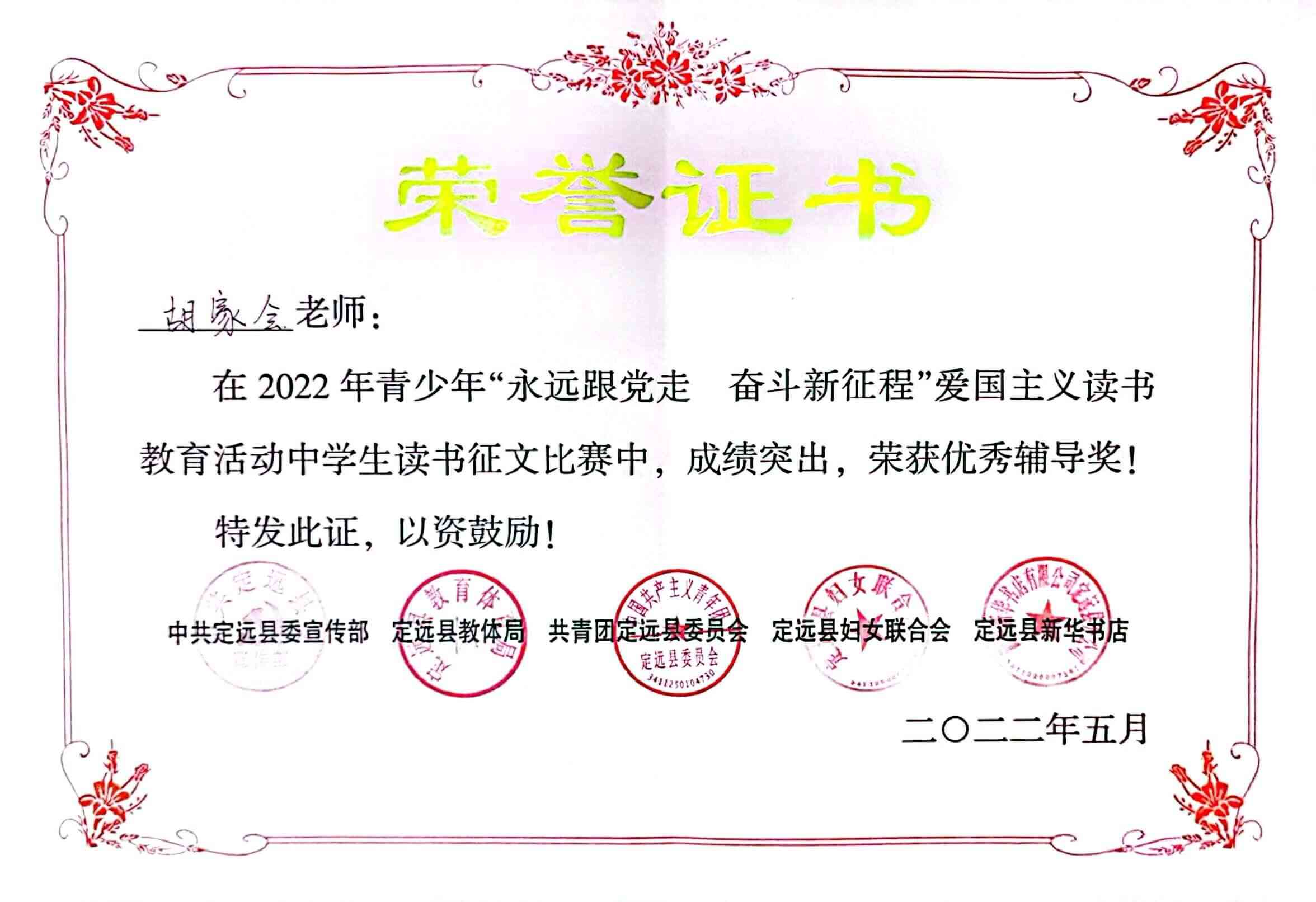 ~ “以文化人,香溢校园”,每学期学校开展有形式多样的主题阅读活动,如开展经典诵读等丰富的校园文化活动,在潜移默化中浸润学生心灵,滋养学生生命。该校的刘紫琳、李奥运同学还在定远县青少年爱国主义教育读书活动中分别获奖。胡家会老师获优秀辅导奖(图文:胡家会 )