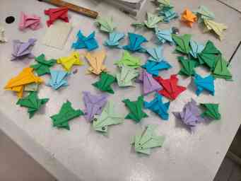 课堂上,学生们用一双双灵巧的小手把一张张普普通通的纸巧妙地折成各种生动有趣的形象。富有情趣小青蛙、纸船、爱心等等,千姿百态、栩栩如生。在动手操作过程中孩子们的想象力、创造力、审美能力得以发展。