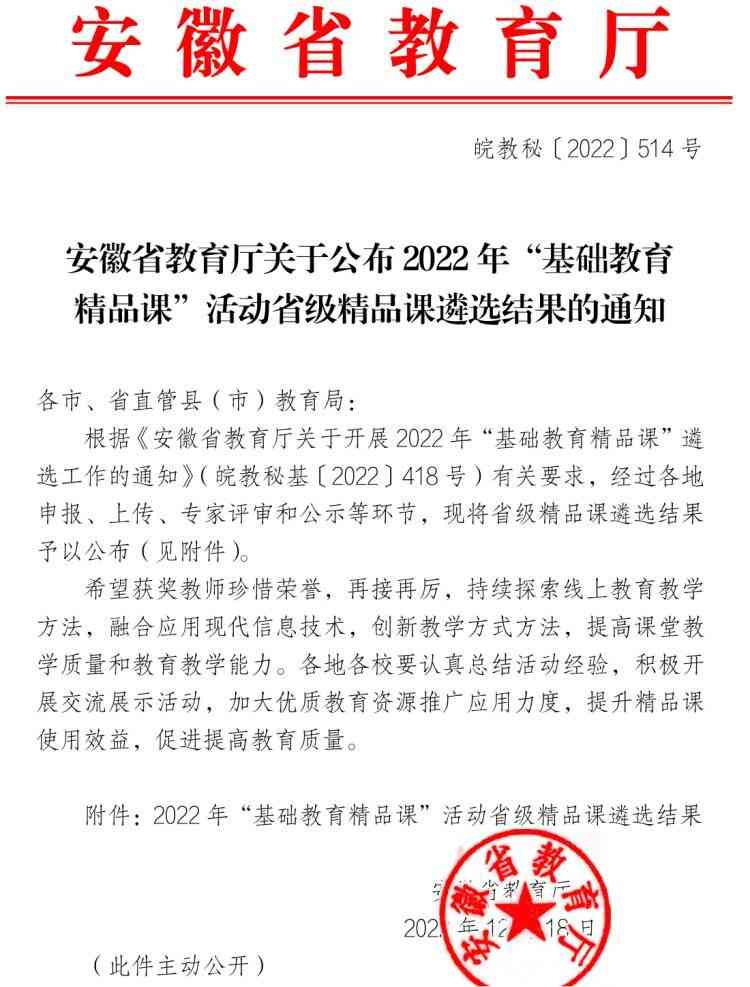 ~ 安徽省教育厅在全省开展了2022年“基础教育精品课”遴选活动。经过教师申报、县级初选、市级遴选、省级评审、公示,12月18日,遴选结果公布,定远县第一初中教育集团数学教研组骨干教师杨伟老师的微课被评为省级“基础教育精品课”。