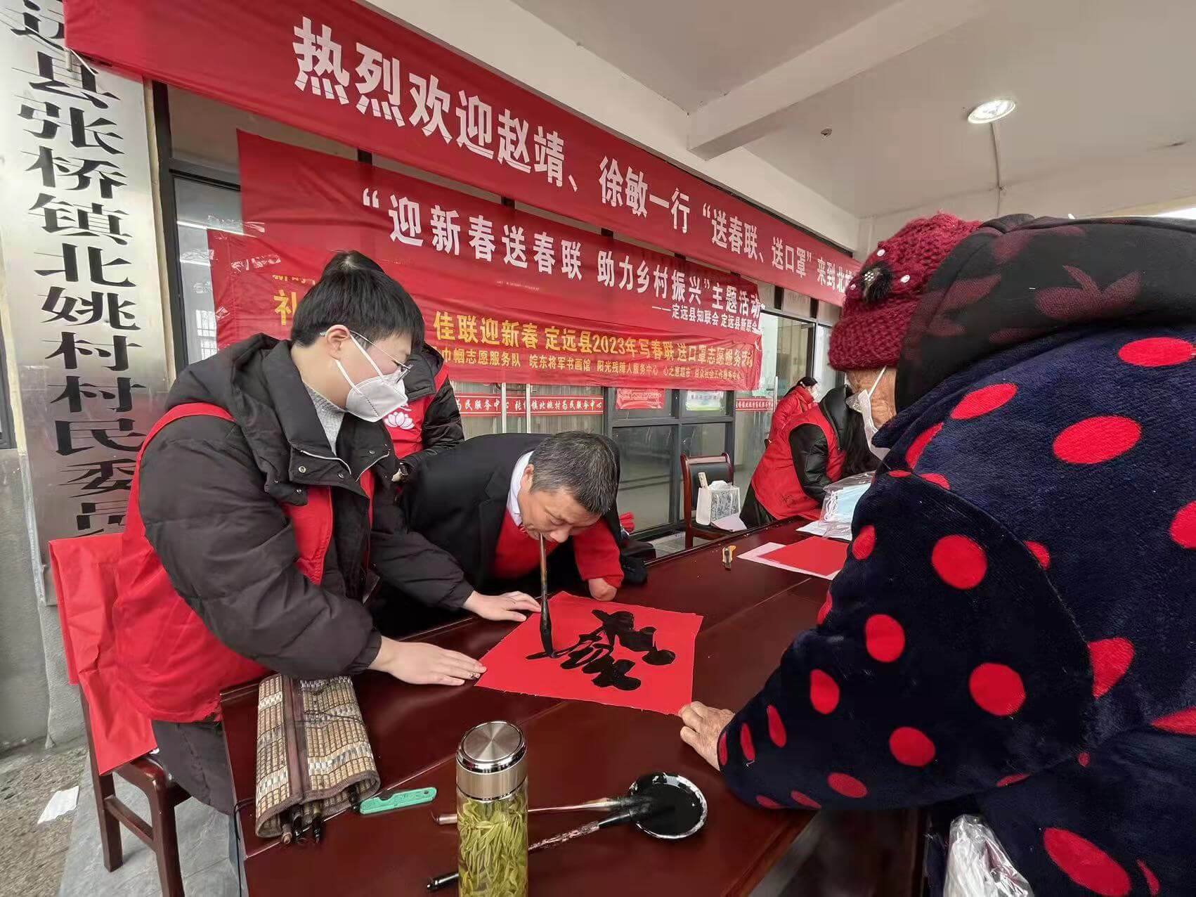 ~ 为喜迎兔年新春,丰富群众文化生活,1月13日上午,皖东将军书画馆、定远县阳光残障人服务中心、县妇联、县巾帼志愿服务队、益众社会工作服务中心联合组织开展迎新春写春联送口罩活动,定远知名书法家赵靖、公益人徐敏一行20余人走进张桥镇,为群众写春联、送口罩,送来新春祝福。