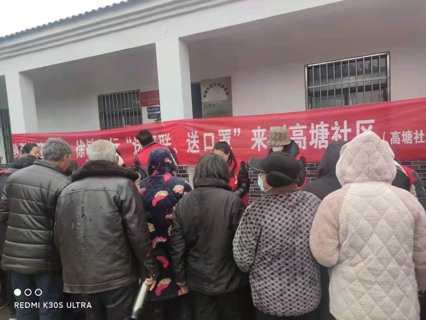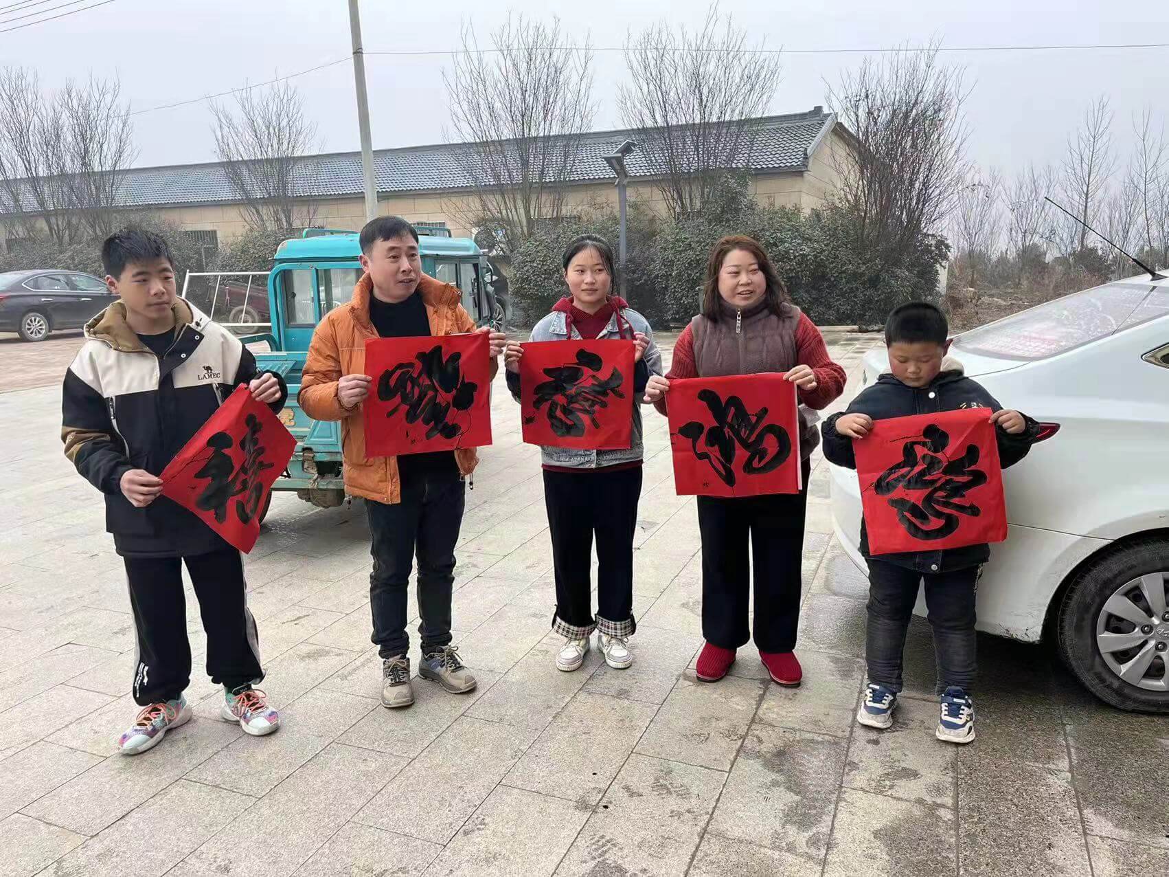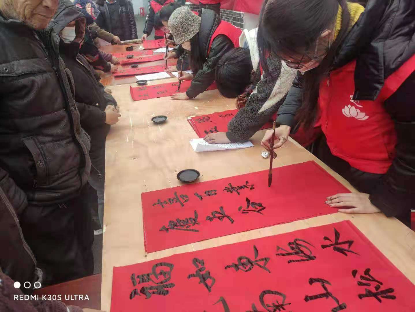 ~ 上午9时,南杨社区活动现场,书法家们不畏严寒,饱含热情,铺纸研墨,即席挥毫,顷刻间一副副满载浓浓春意的春联便跃然纸上,浓浓的情意、真诚的祝福洋溢在字里行间,会聚在一包包口罩上,现场群众一手拿着包装精美的口罩,一手拿着刚领到春联,满脸都是幸福的笑容。下午1点30分,赵靖、徐敏一行来到该镇北姚村,刚过午饭时间,村前广场已是聚满群众。书法志愿者们再度热情高涨,活动现场,红纸翻飞,翰墨飘香。楷、隶、行、草、篆便瞬间跃然纸上。同时,县阳光残障人服务中心的志愿者们也为在场的群众散发kn95口罩。大包、小包的口罩传递着温馨,长句、短句的春联传递祝福。大家边欣赏、边拍照,手持春联和口罩,笑逐颜开。洁白的口罩预示着来年的安康如意,红彤彤的春联更是把活动现场映衬得年味十足。下午3点30分,赵靖、徐敏一行来到了此次活动的最后一站高塘社区。这里已围满了等候的群众。热情鼓舞着干劲、爱心驱使着热情,书法志愿者们不辞辛劳,再一次笔走龙蛇,志愿者们为在场的群众散发了爱心口罩一份。一副副反映新农村、新生活的书法春联倍受群众的喜爱,拿着写满美好憧憬的春联和充满寓意的口罩,喜悦之情溢于言表,连连道谢点赞。