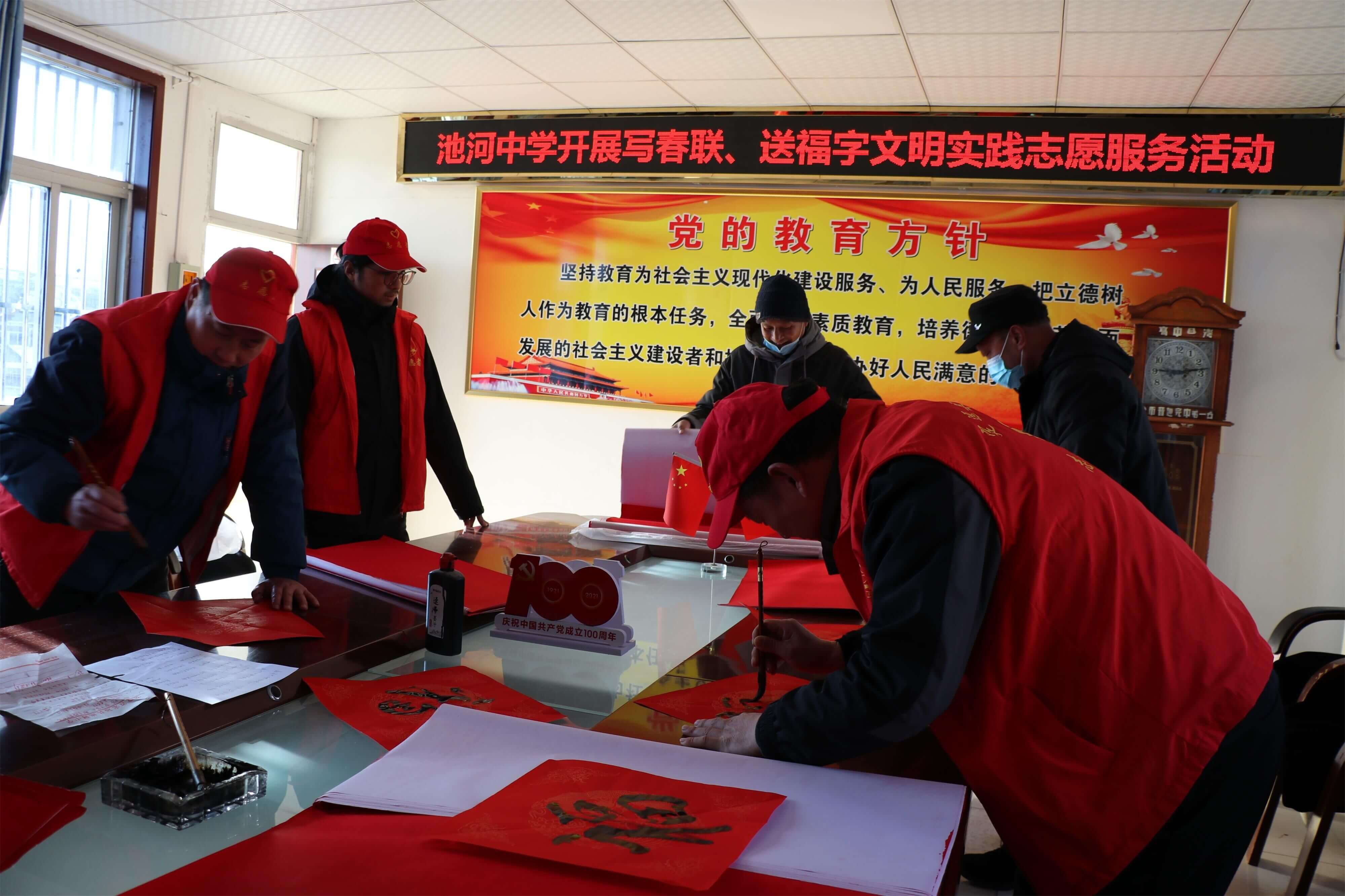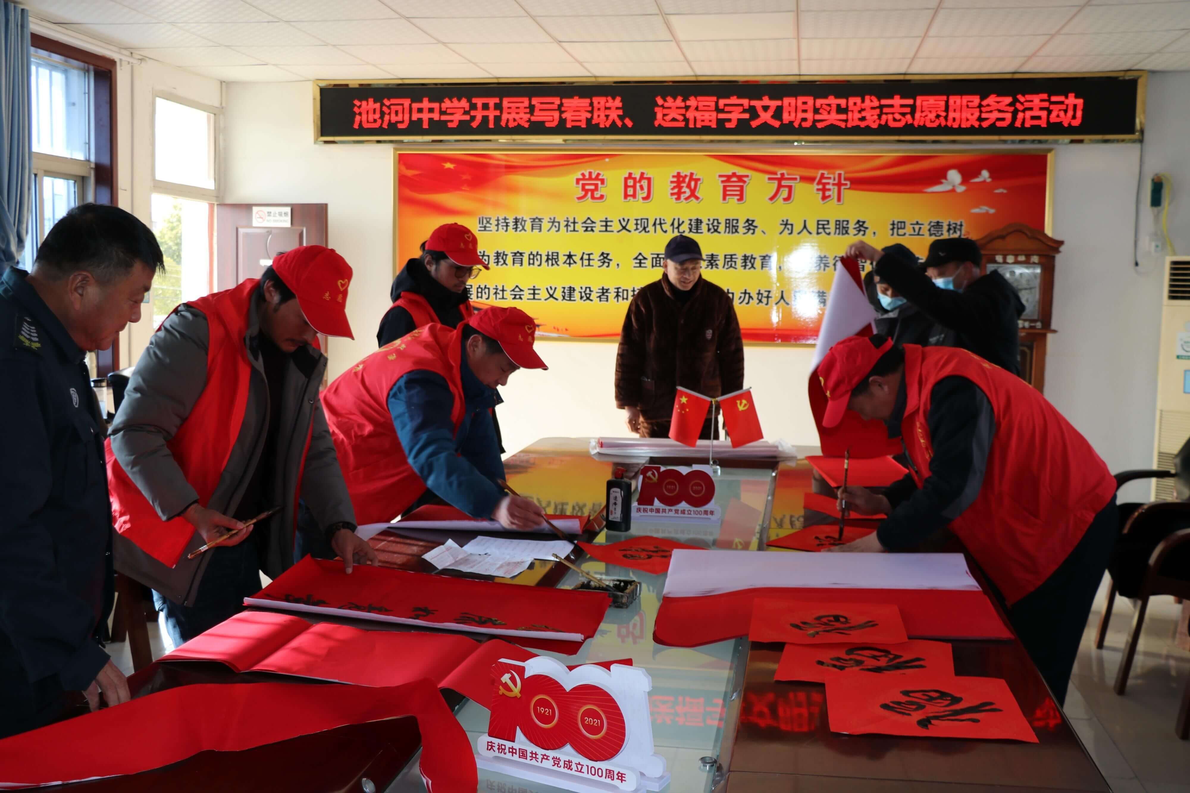 ~ 新春渐临近,祖国更美好。为喜迎2023年新春佳节, 1月15日下午,雪后初霁,定远县池河中学政教处、团委组织开展“写春联 送福字”文明实践志愿服务活动。