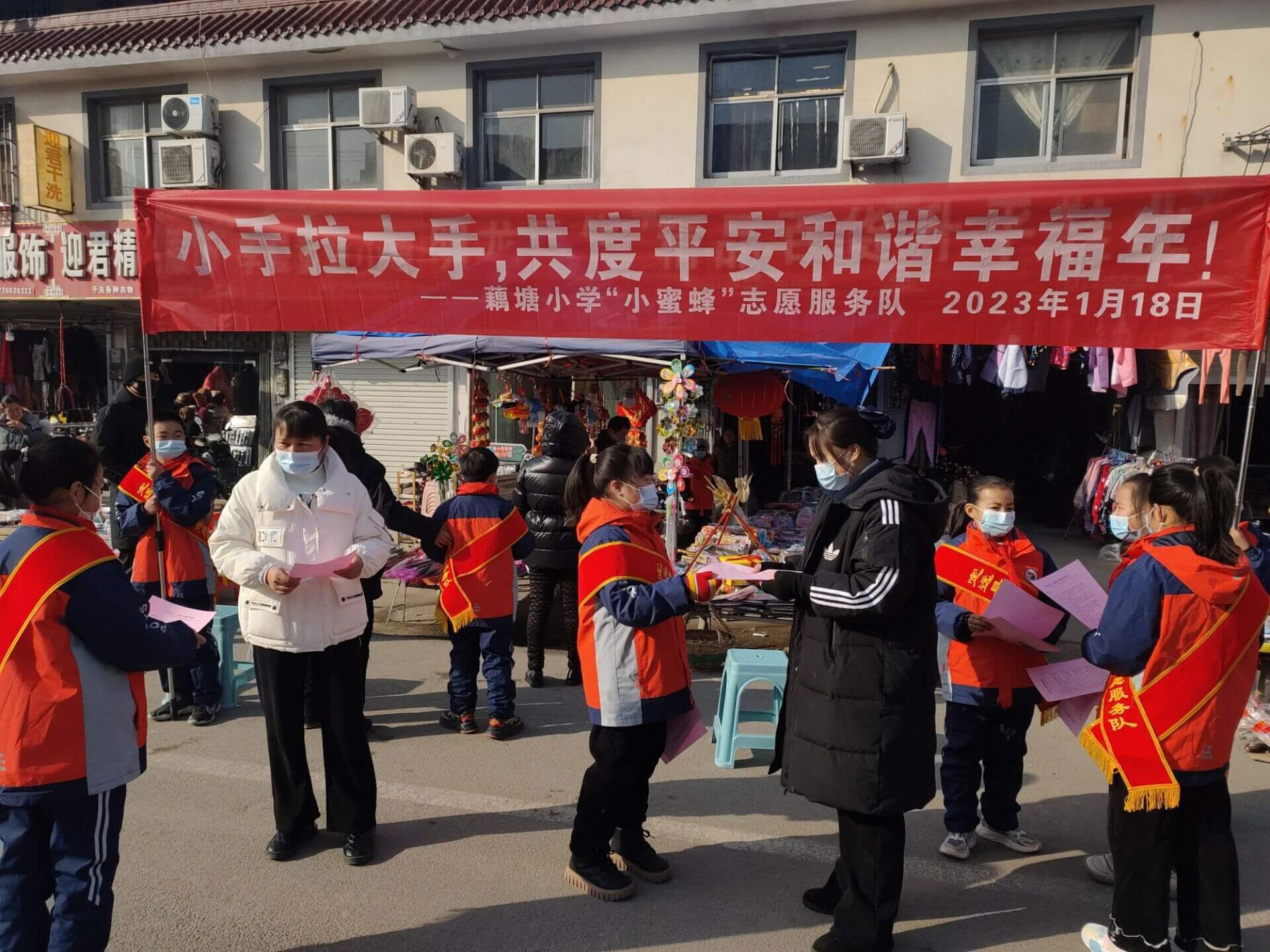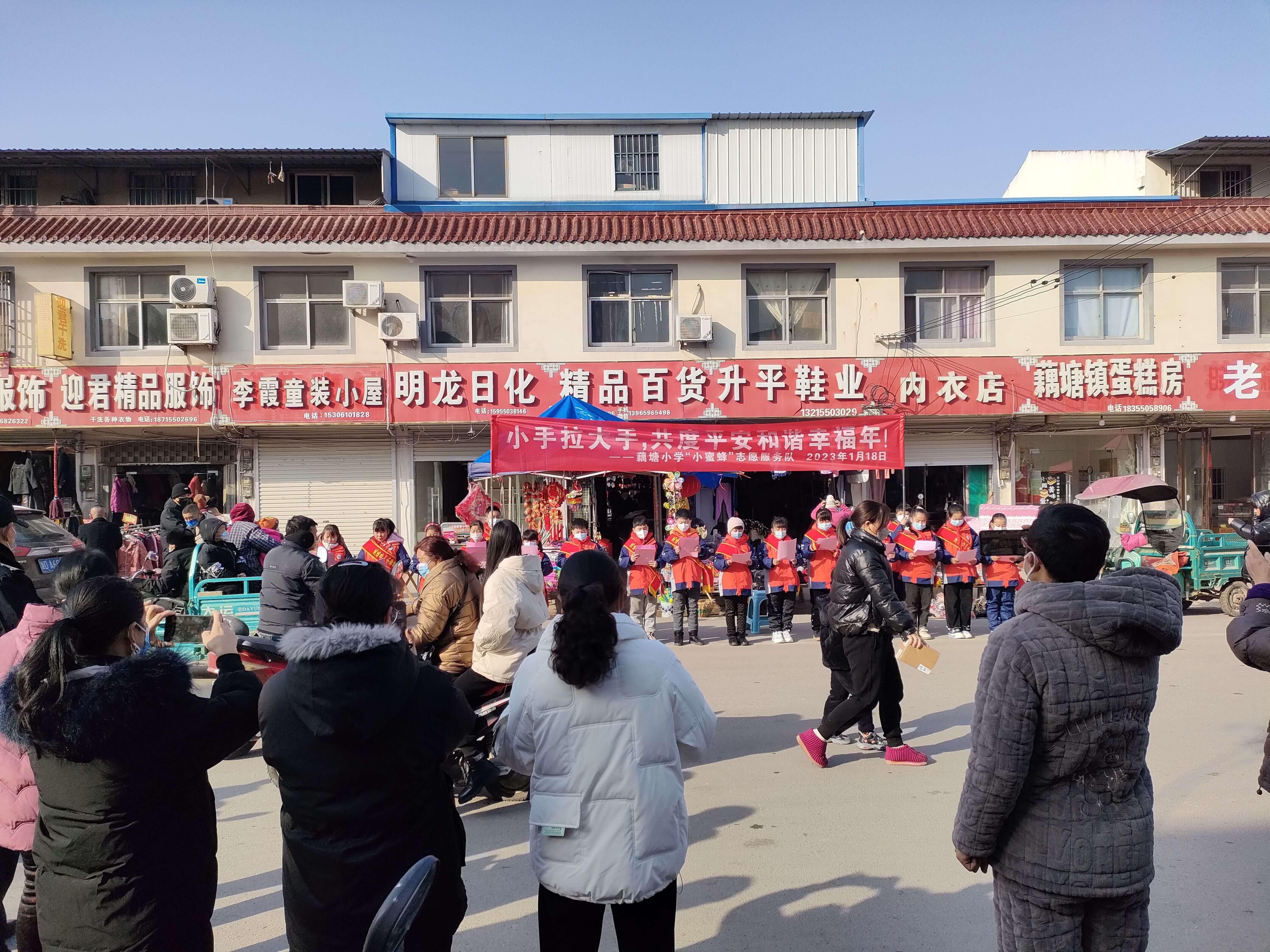 ~ 伴随着春节临近,返乡人员逐渐增多,为了让全镇人民度过一个平安和谐的幸福年,1月18日,定远县藕塘小学“小蜜蜂”志愿服务队走上街道,开展“小手拉大手,共度平安和谐幸福年”志愿宣传活动。