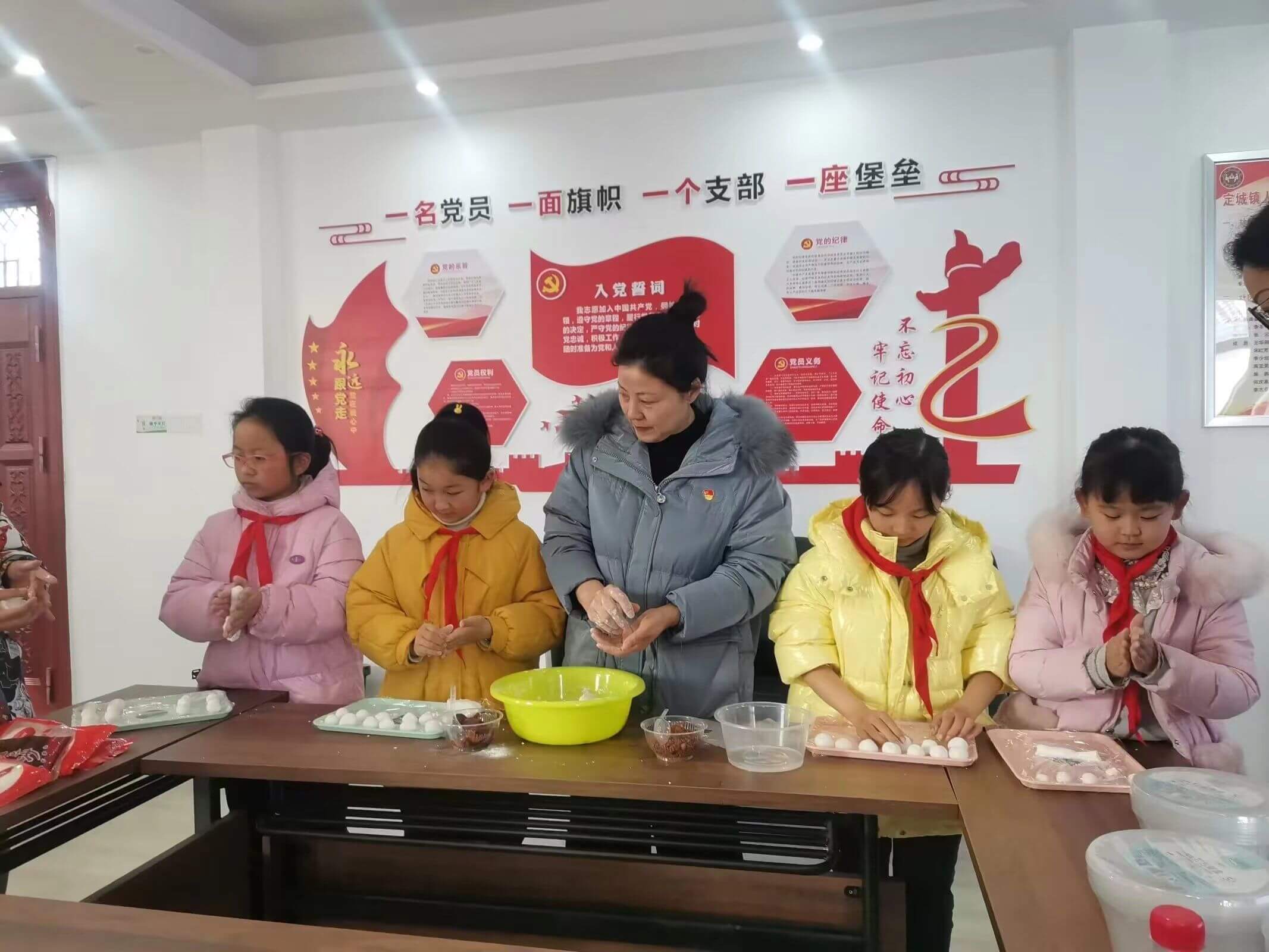 ~ 活动中,人民路社区老党员代表为少先队员们深入讲述了元宵节的起源,详细介绍了元宵节传承延续下来的赏花灯、吃汤圆、猜灯谜、放烟花等传统民俗活动,深情回忆了定远县游龙灯、舞狮子、踩高跷、划旱船等欢度元宵节的传统庆祝方式。随后的制作汤圆比赛环节中,在老党员同志的指导下,少先队员们亲身体验了和面、包馅、收口、搓圆等制作过程,老党员与少先队员们共同制作的场景,展现出中华传统文化代代传承的和谐画面,制作现场充满了欢声笑语。