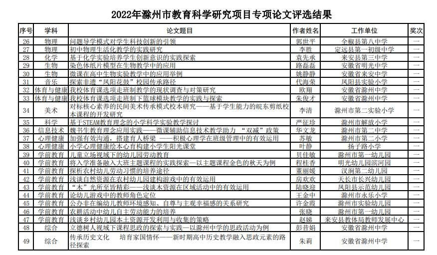 ~ 日前,滁州市教体局下发通知《关于开展2022年滁州市教育科学研究项目专项论文评选活动的通知》(滁教体研函〔2022〕296号),公布了2022年滁州市教育科学研究项目专项论文评选活动获奖名单,定远县第一初中教育集团多项成果获奖,其中,一等奖1篇,二等奖3篇,三等奖3篇。
