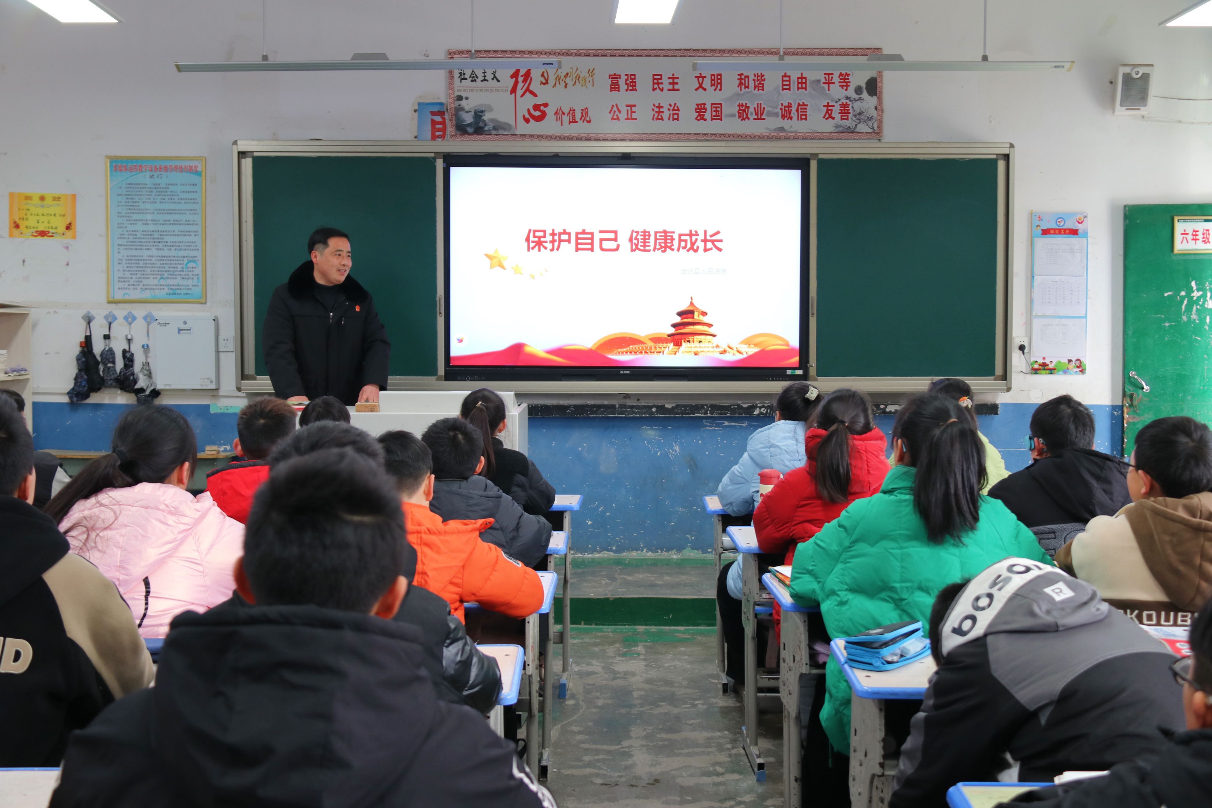 ~ “同学们,你们知道法律是什么吗?”课堂上,课堂上,宋院长以《民法典》《未成年人保护法》为重点,结合真实案例,用通俗易懂的语言为学生们讲解了校园欺凌、网络诈骗以及火灾自救等方面的知识,引导教育全体师生树立法治思想、运用法治思维,切实做好自身安全保护。