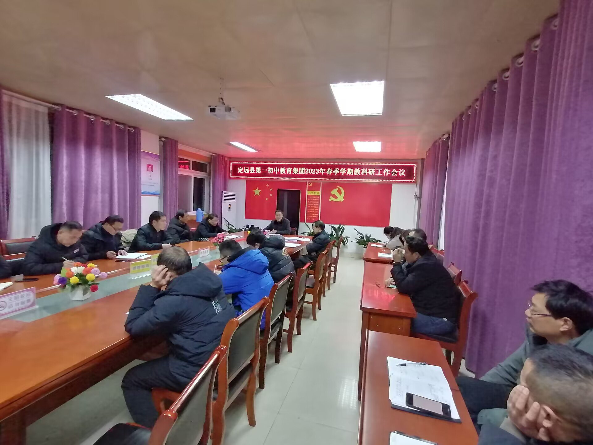 ~ 2月14日,定远县第一初中教育集团在南环路校区会议室召开了新学期教科研工作会议。分管副校长、教导处负责人、全体教研组长和课题组长参加了会议。会议由集团党支部书记、校长张书清主持。