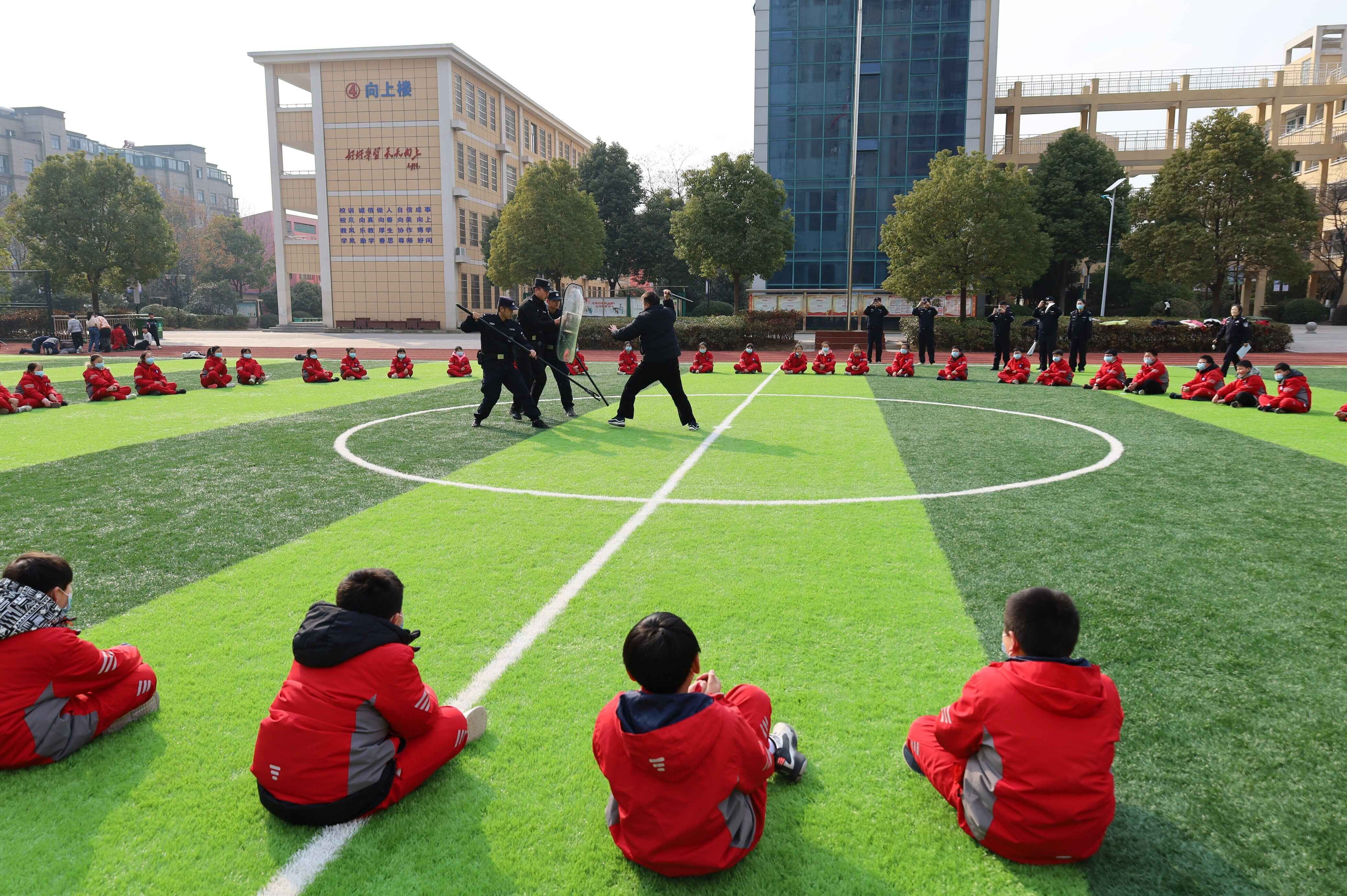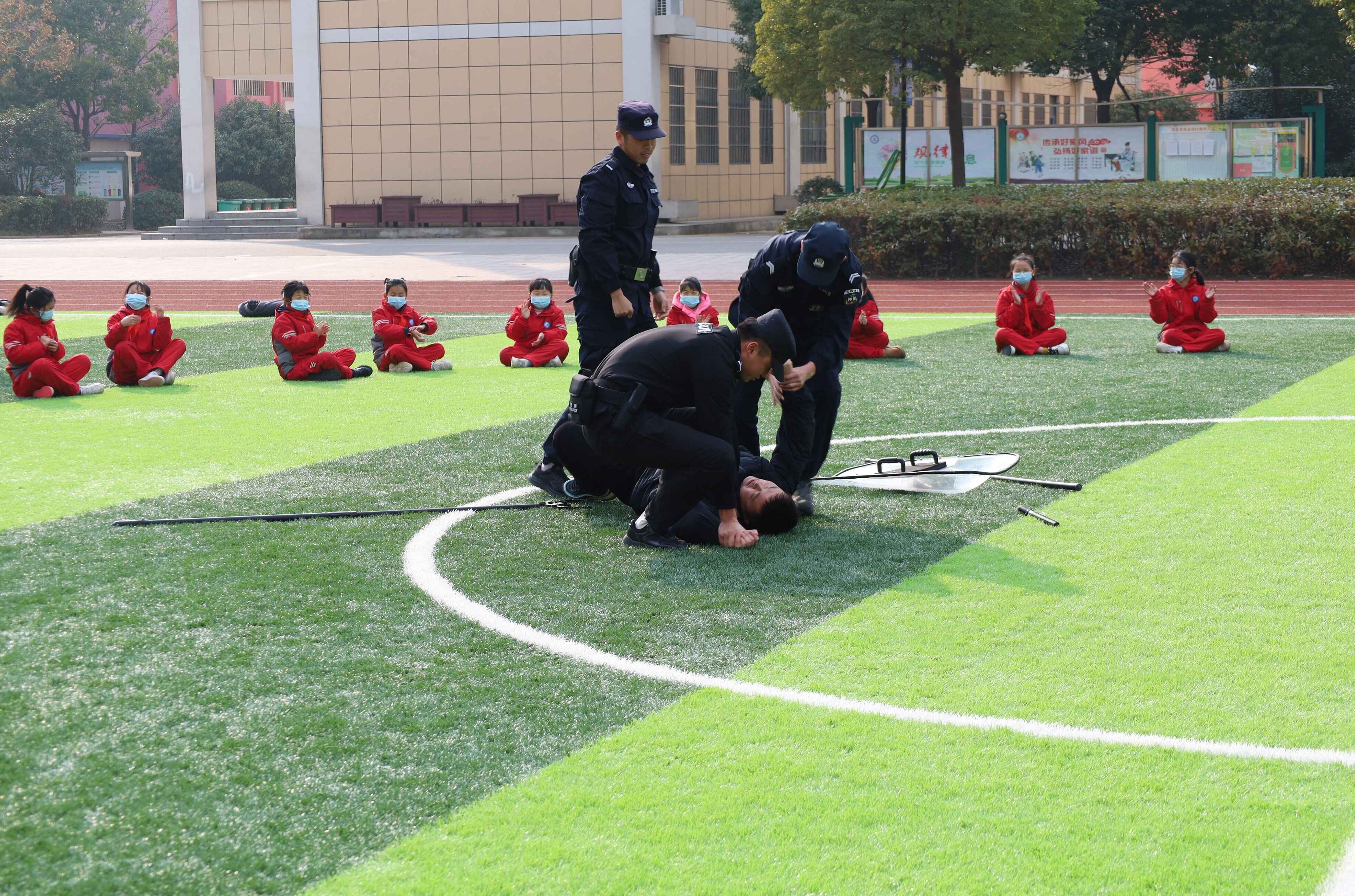 2月24日,定远县新区实验学校教育集团新区实小校区联合曲阳派出所和东门广场警务站开展反恐演练活动。