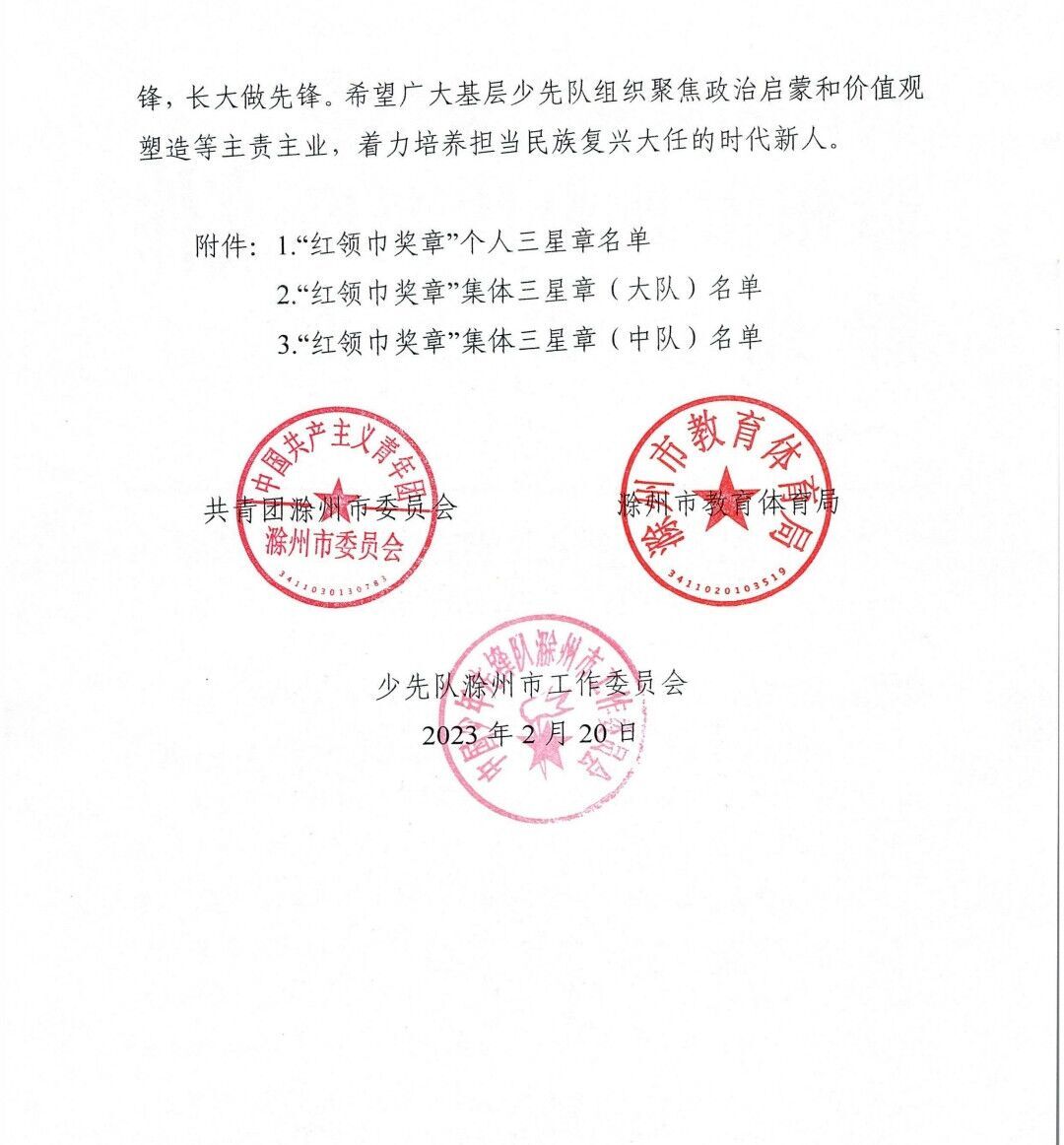 ~ 希望荣获“红领巾奖章”三星章的个人珍惜荣誉,再接再厉,发扬表率作用,争取更大成绩。希望广大少先队员要向受到表扬的优秀少先队员学习,听党话、跟党走,练就过硬本领,努力成长成为能够担当民族复兴大任的时代新人。希望广大少先队组织始终抓住思想政治引领这个关键,着力建设积极向上、团结友爱的少先队集体,努力培养德智体美劳全面发展的社会主义建设者和接班人。(图文:凌治德 审核:张锦东)