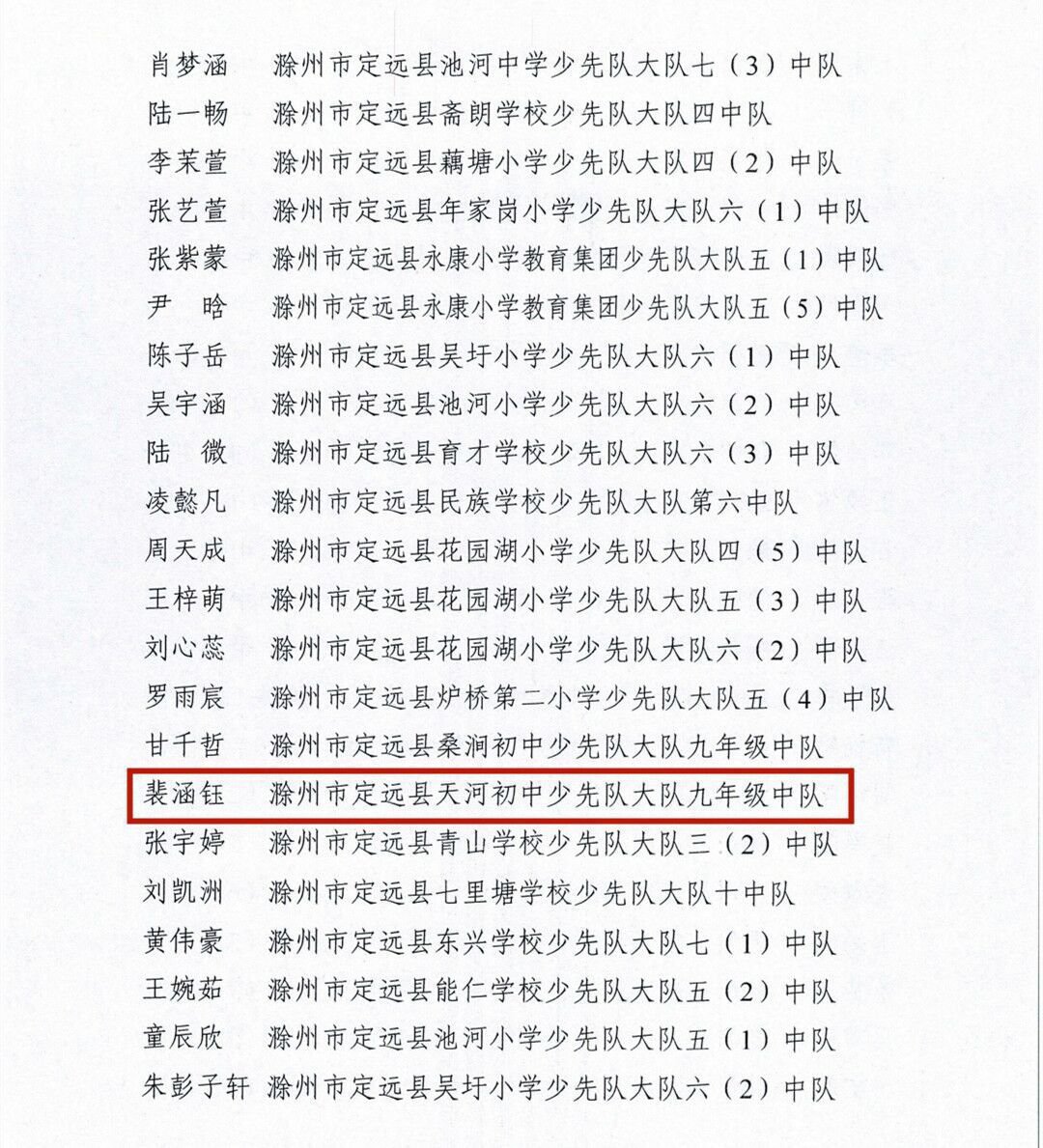 ~ 近日,共青团滁州市委、滁州市教育局、少先队滁州市工作委员会联合公布《关于对2022年度滁州市“红领巾奖章”三星章主题宣传活动的通报》,定远县天河初中一中队裴涵钰同学获评2022年度滁州市“红领巾奖章”个人三星章荣誉称号。