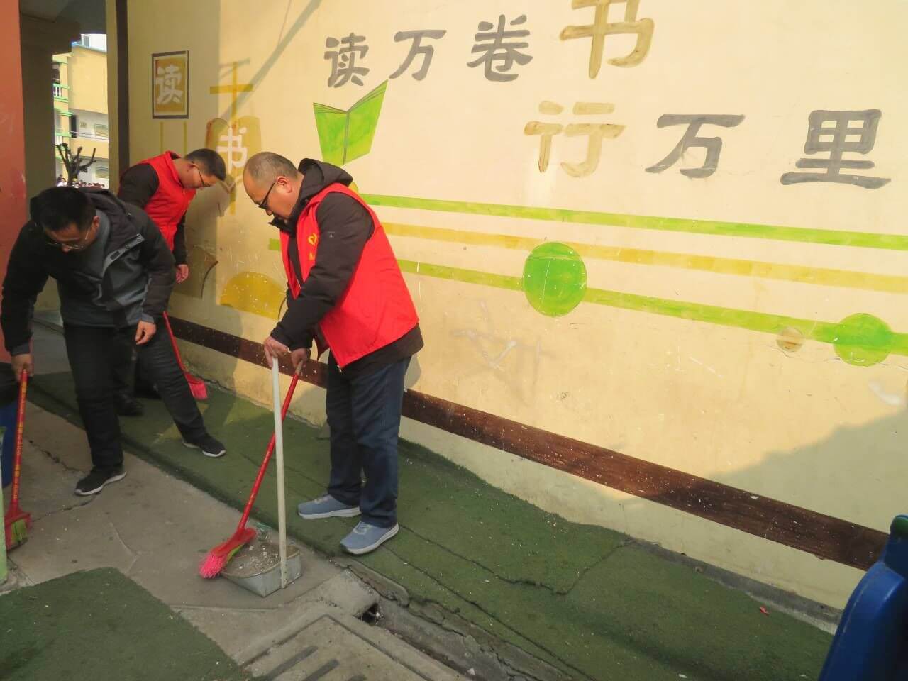 ~ 活动中,志愿者们打扫校园车棚、擦拭水池污渍、清理卫生死角、捡拾花坛里的垃圾,校园环境面貌一新。