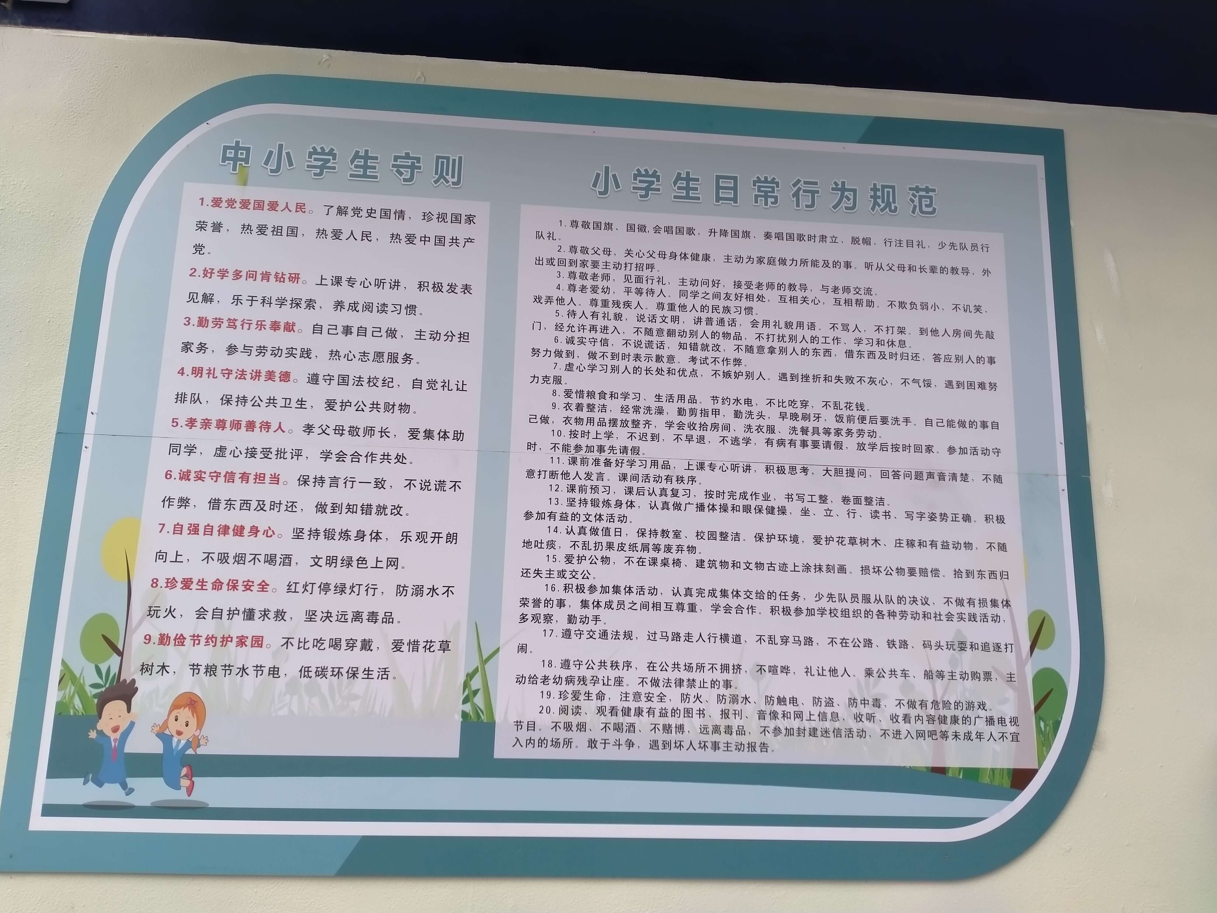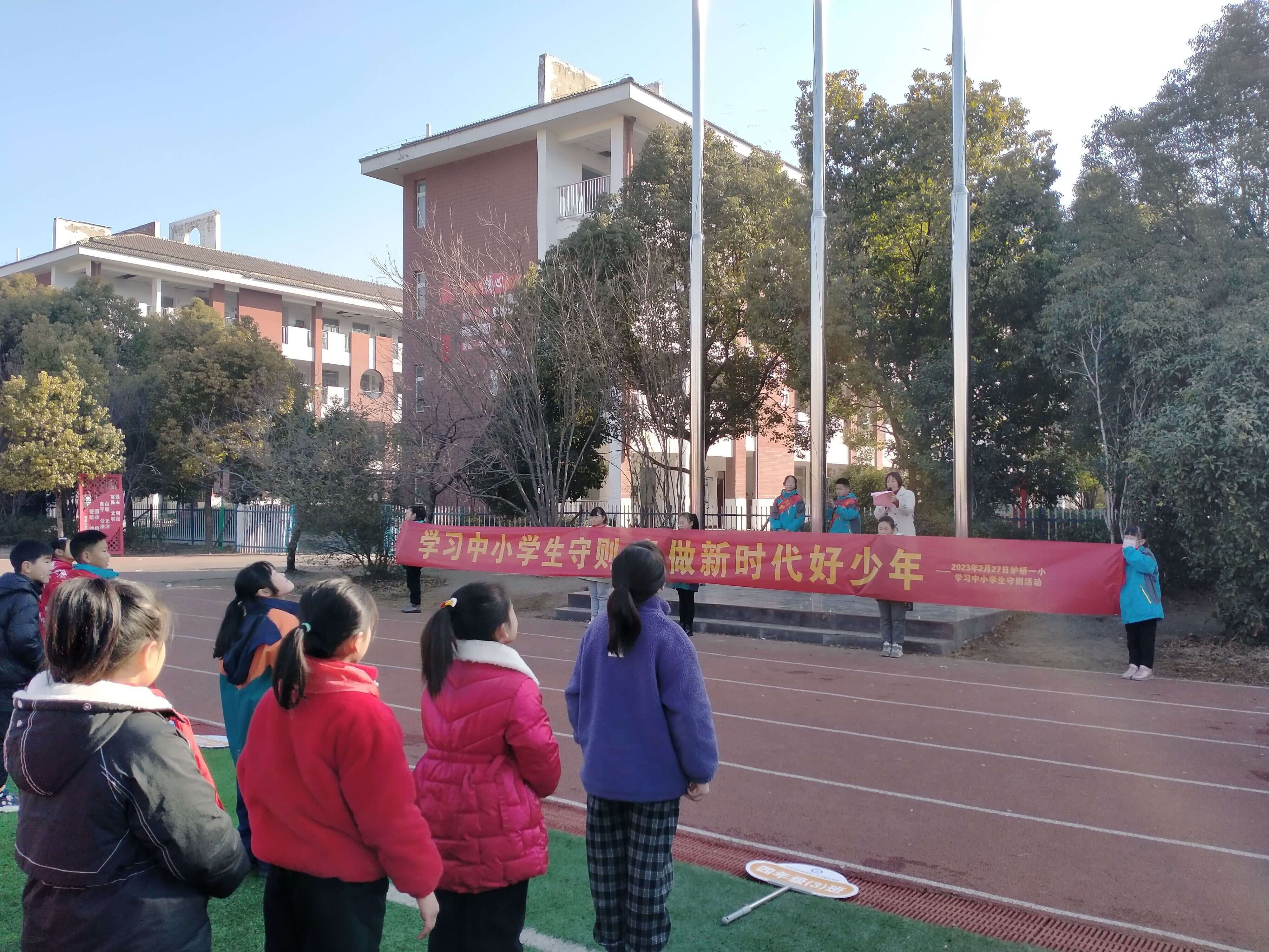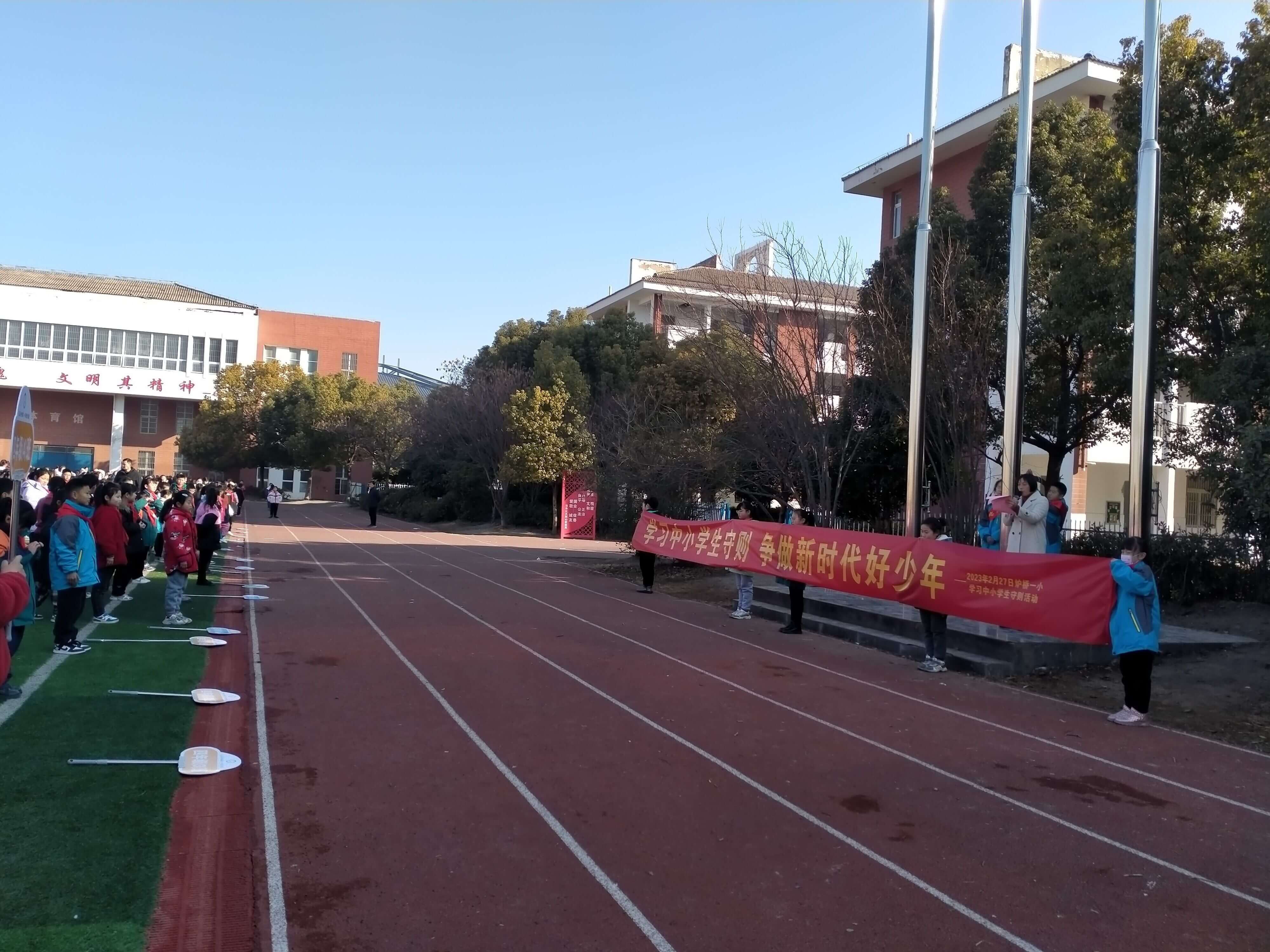 ~ 该校通过电子显示屏、横幅、微信公众号、校园橱窗等方式进行积极地宣传教育。各班组织学生通过观看视频、抄写守则、背诵守则、征文比赛等方式,认真学习《中小学生守则》。2月27日,该校隆重举行了学习《中小学生守则》国旗下讲话活动。教导处兰颖同志号召同学们,要严格要求自己,从一点一滴做起,在家做一个好孩子,在校做一名好学生。