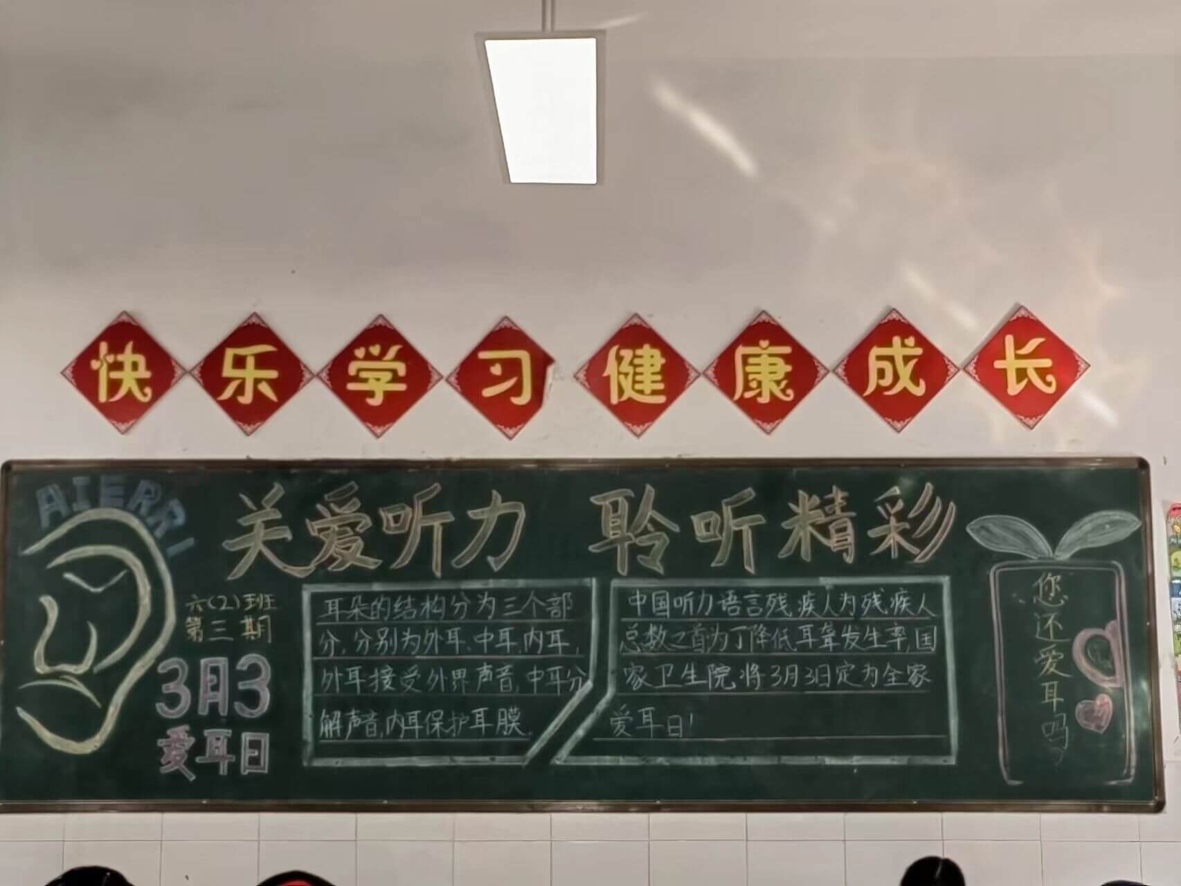 ~ 活动中,各班主任用通俗易懂的语言,为学生们讲解了爱耳护耳健康知识。老师们从耳朵的功能、不良的生活习惯对耳朵的伤害、日常生活中如何保护耳朵等方面,进行了详细解说,让孩子们充分认识到爱耳护耳的重要性,同时各班级还通过板报宣传的形式教育学生爱护耳朵,关注健康。
