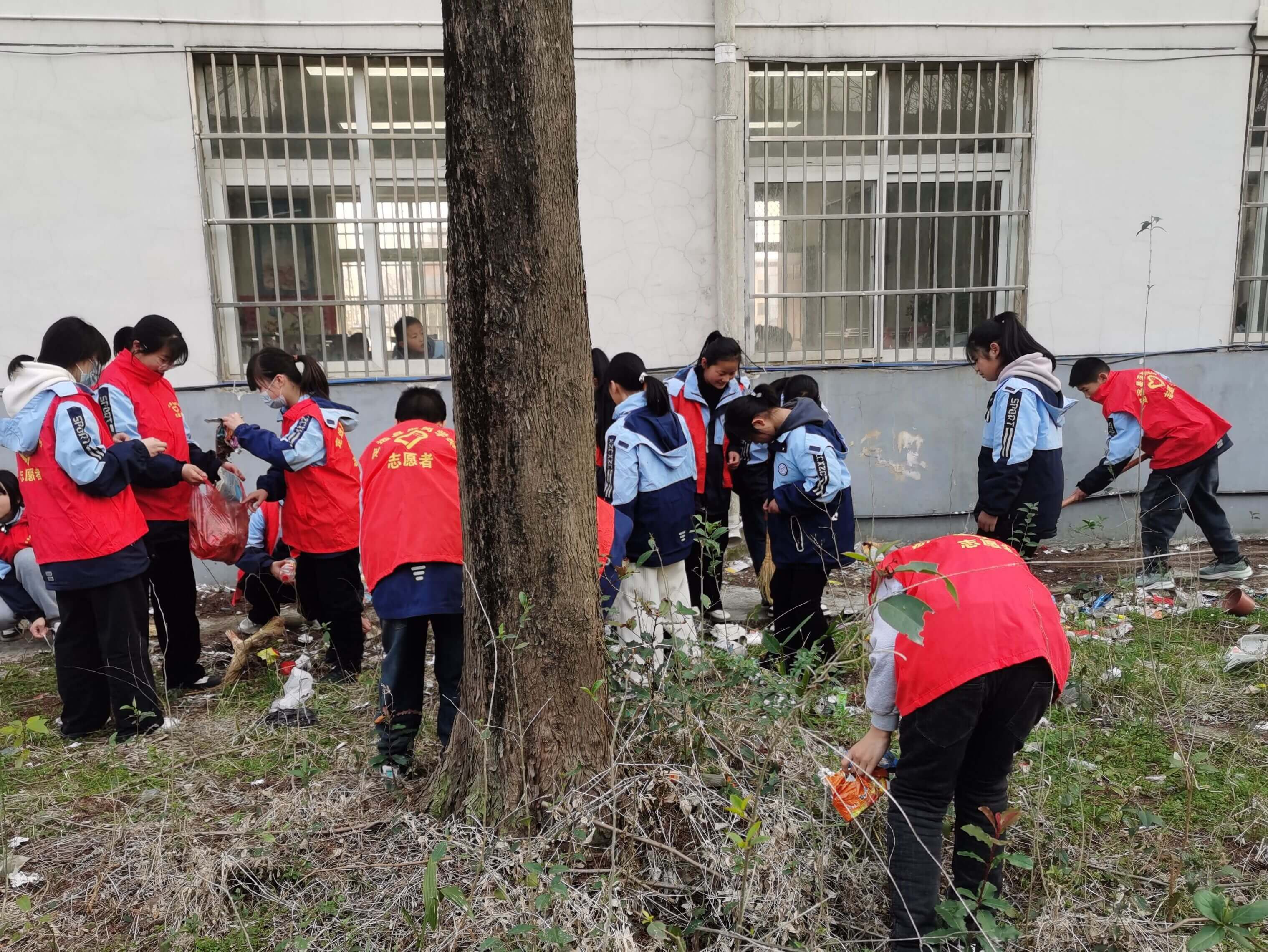 ~ 该校团员志愿者来到退休教师宿舍区清理杂草和绿化带垃圾,捡拾烟头和纸屑。他们不怕脏、不怕累,经过1个多小时的共同努力,宿舍区环境变得焕然一新,整洁有序。