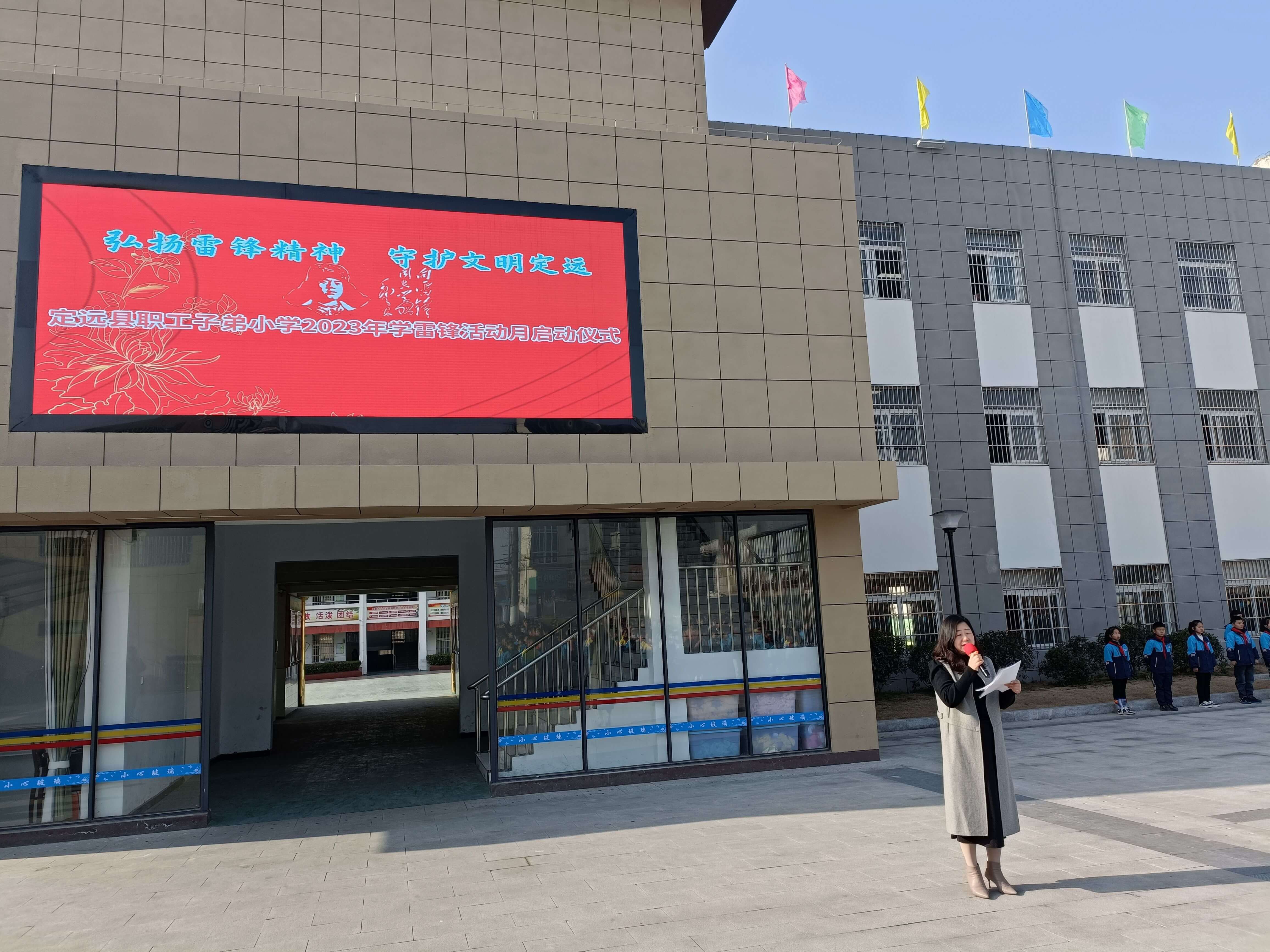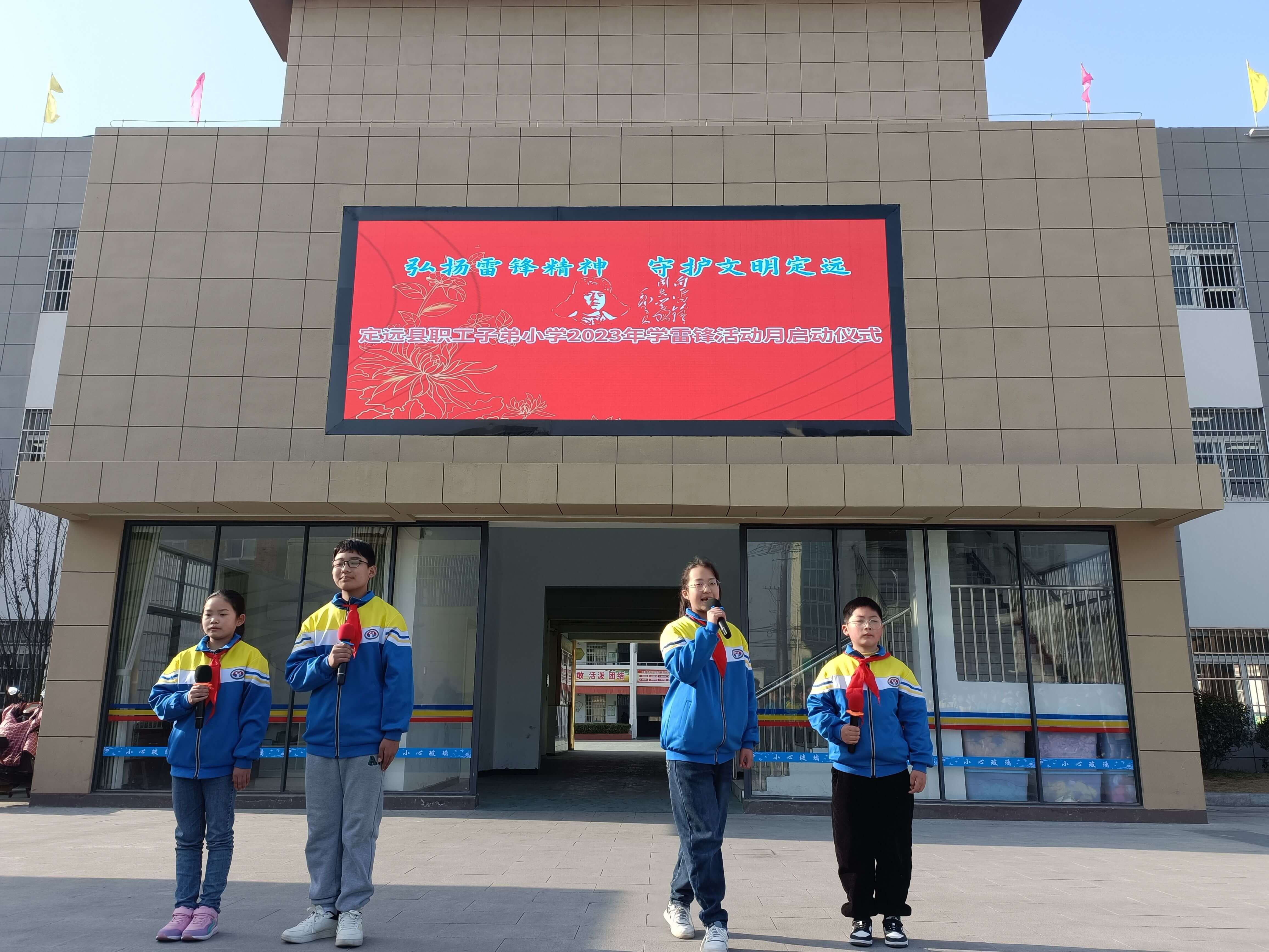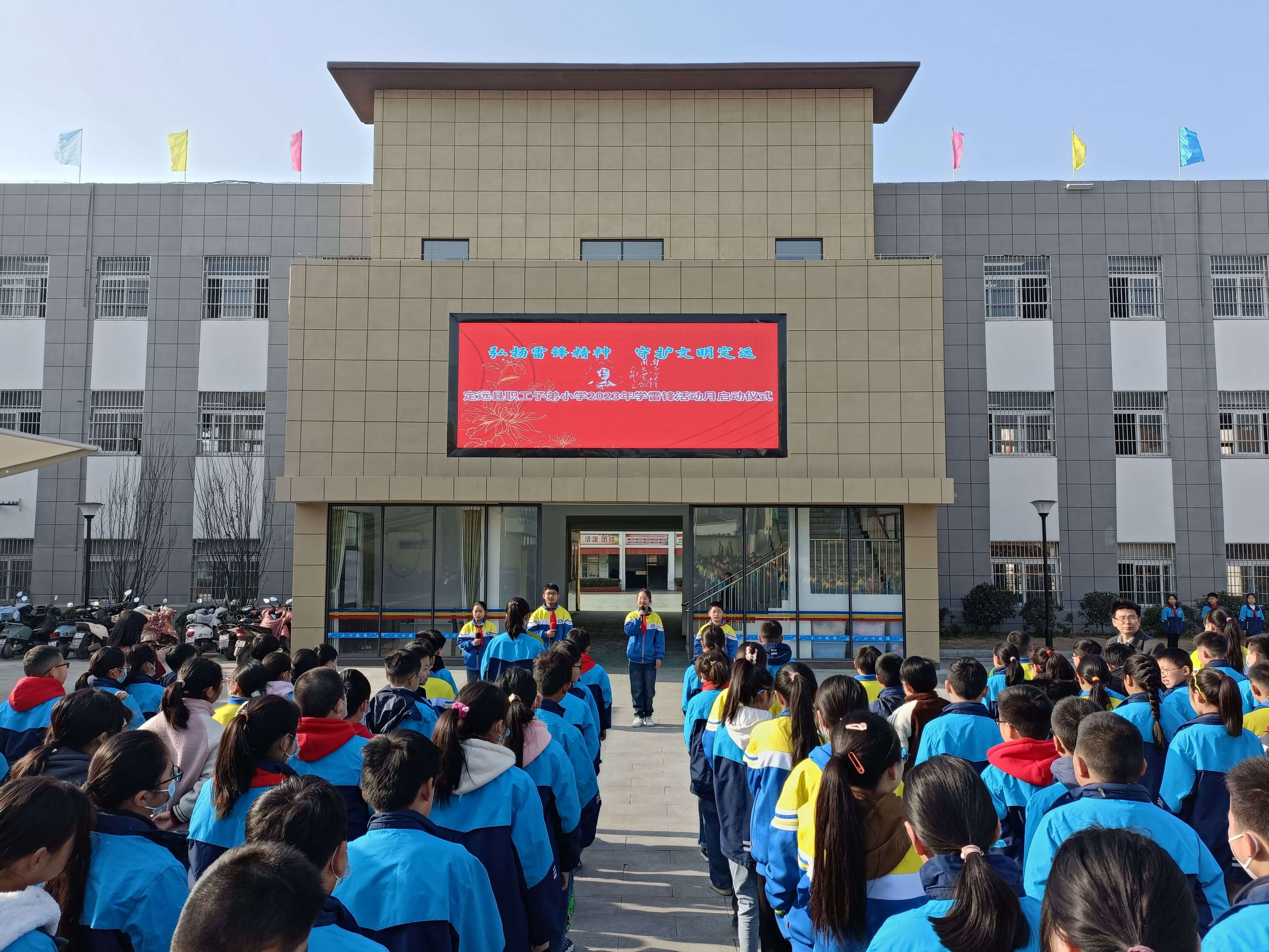 ~ 为传承雷锋精神,增强学生奉献服务意识,大力弘扬“奉献、友爱、互助、进步”的志愿服务精神,3月6日上午,定远县职工子弟小学全体师生在操场举行了“弘扬雷锋精神 守护文明定远”为主题的2023年学雷锋活动月启动仪式。