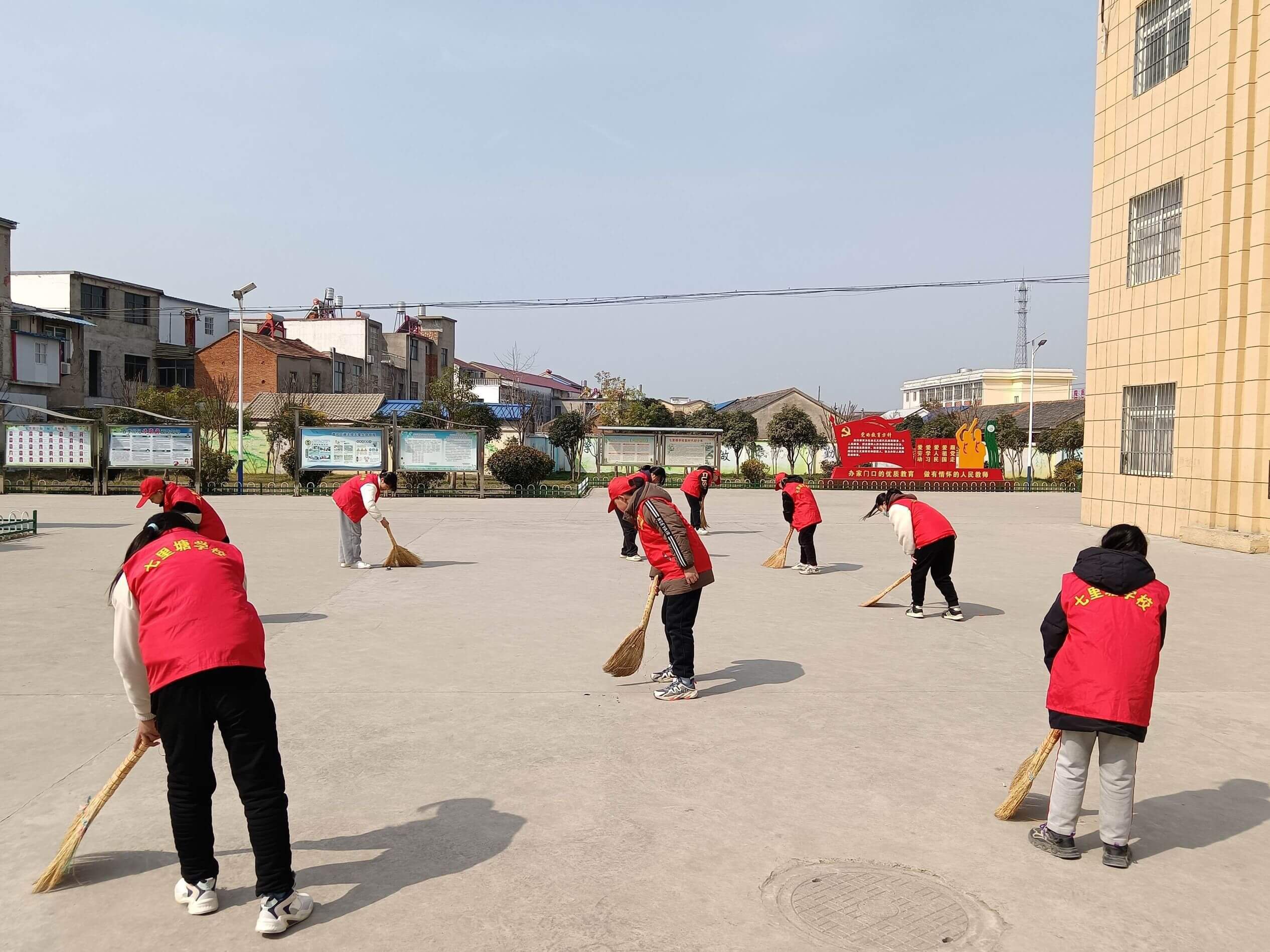 ~ 活动现场,同学们手持扫帚、抹布等工具穿梭在校园的各个角落,相互合作,各司其职,有的负责清洁教室黑板、地面,有的负责清理窗台、桌椅的积尘,有的负责在室外公共卫生责任区清扫落叶、捡拾纸屑。大家忙得热火朝天,对里里外外每个卫生死角都进行了全面细致的打扫。通过一个多小时的努力,整个校园变得干净整洁,得到老师们的高度赞扬。