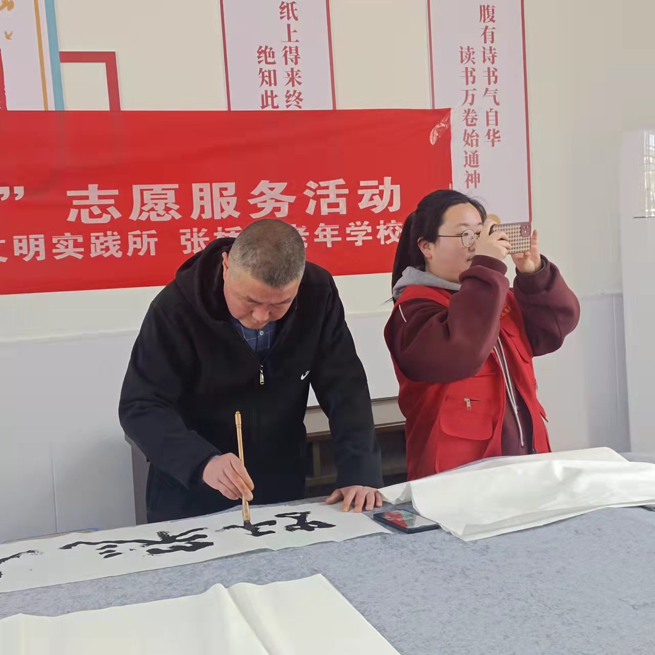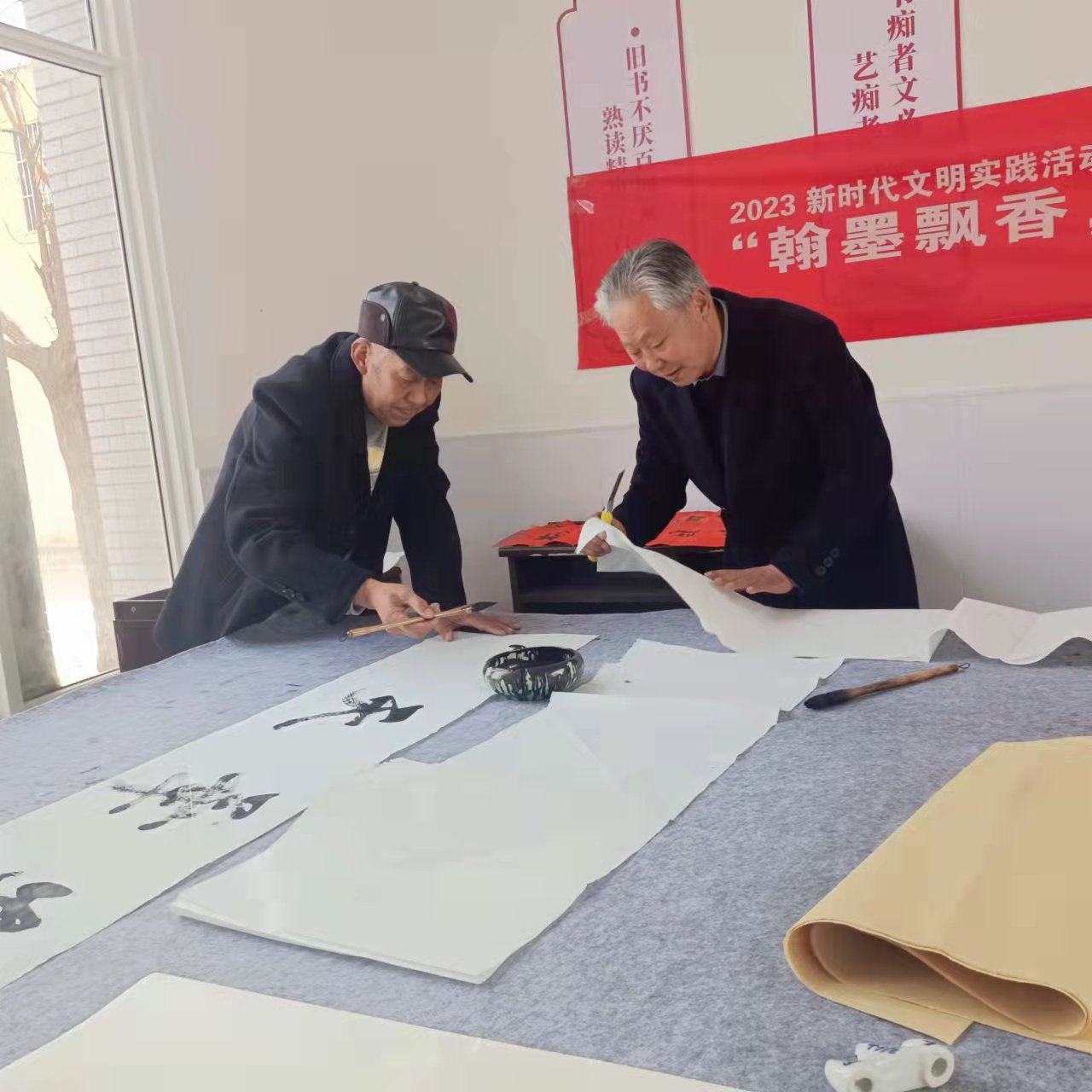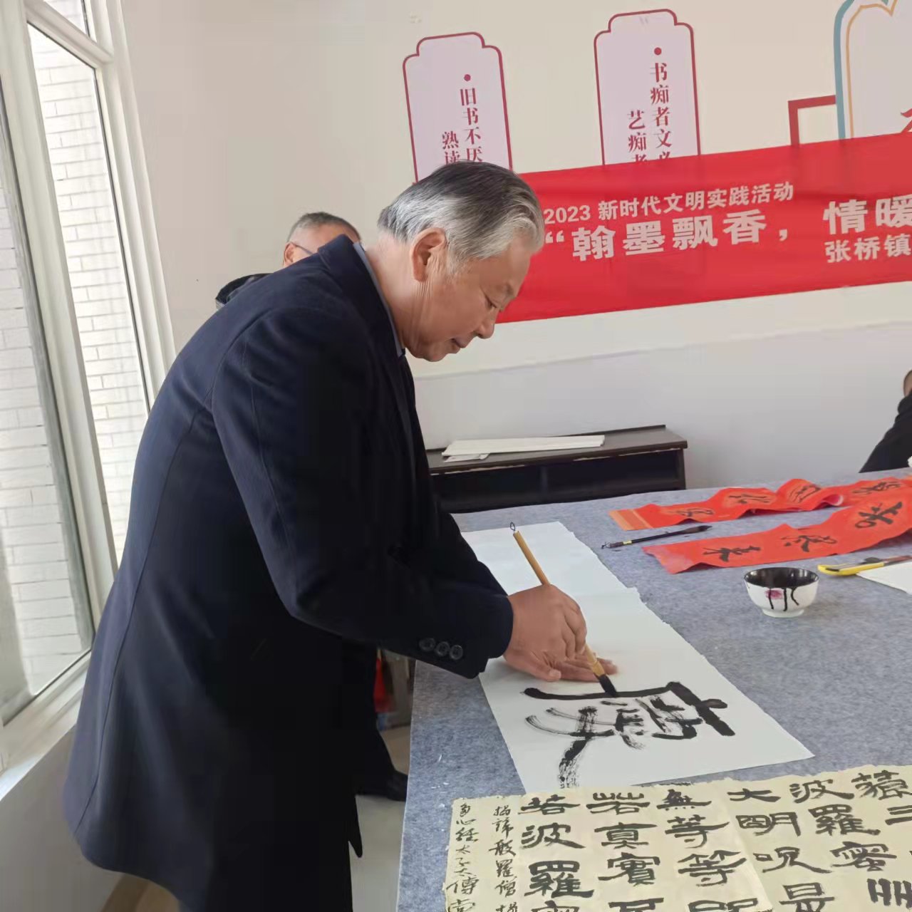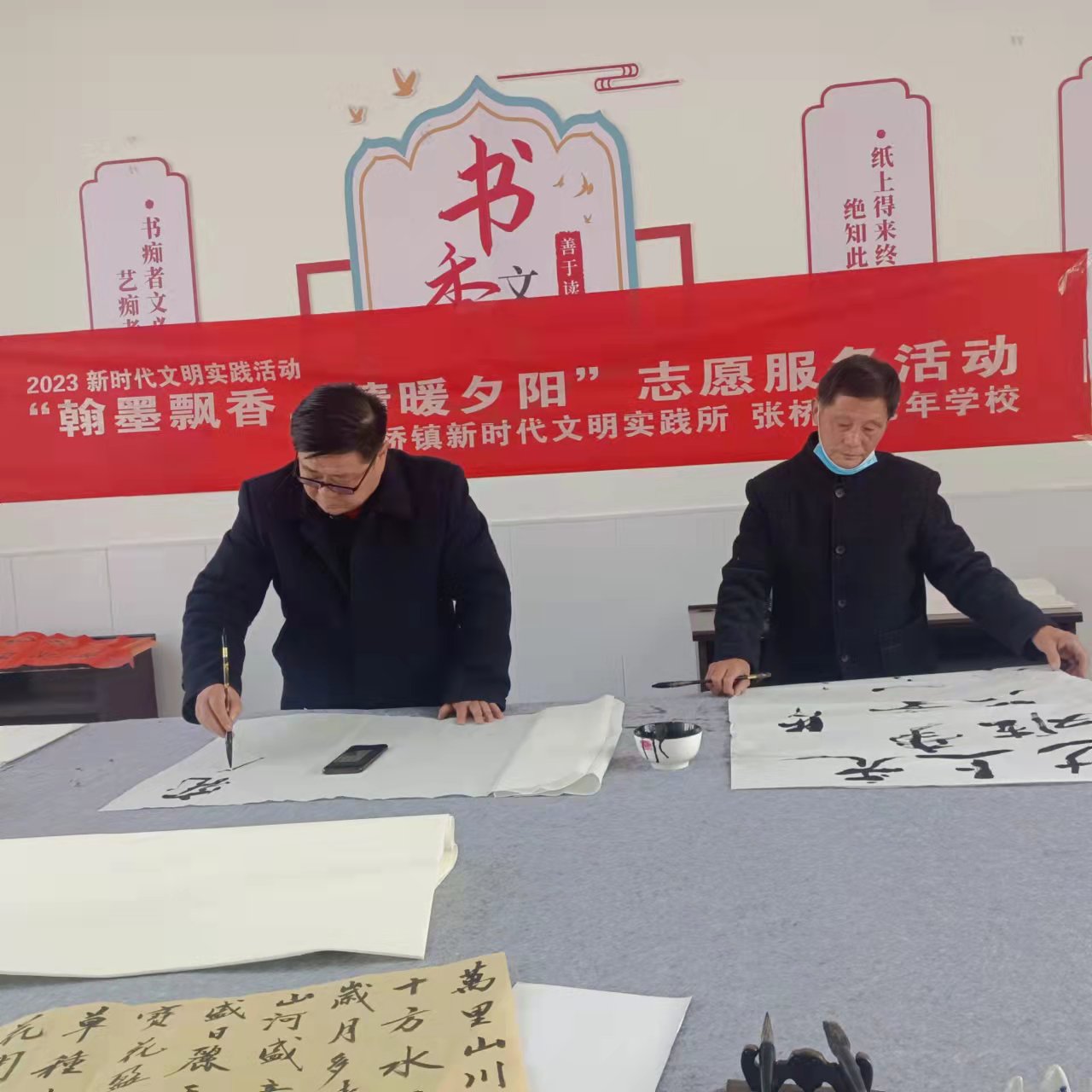 ~ 来自县青年书法协会的杨亚东主席,与参加活动的22名农民书法爱好者一起交流和学习书法心得。活动中,墨香四溢,笑声朗朗,暖意融融,书法爱好者尽情挥毫泼墨,两个多小时的笔会交流活动,共创作出18幅书法作品,大家喜气洋洋地挂在书法班的展示墙上,每个人脸上都洋溢着对传统文化——书法艺术的喜爱之情 。