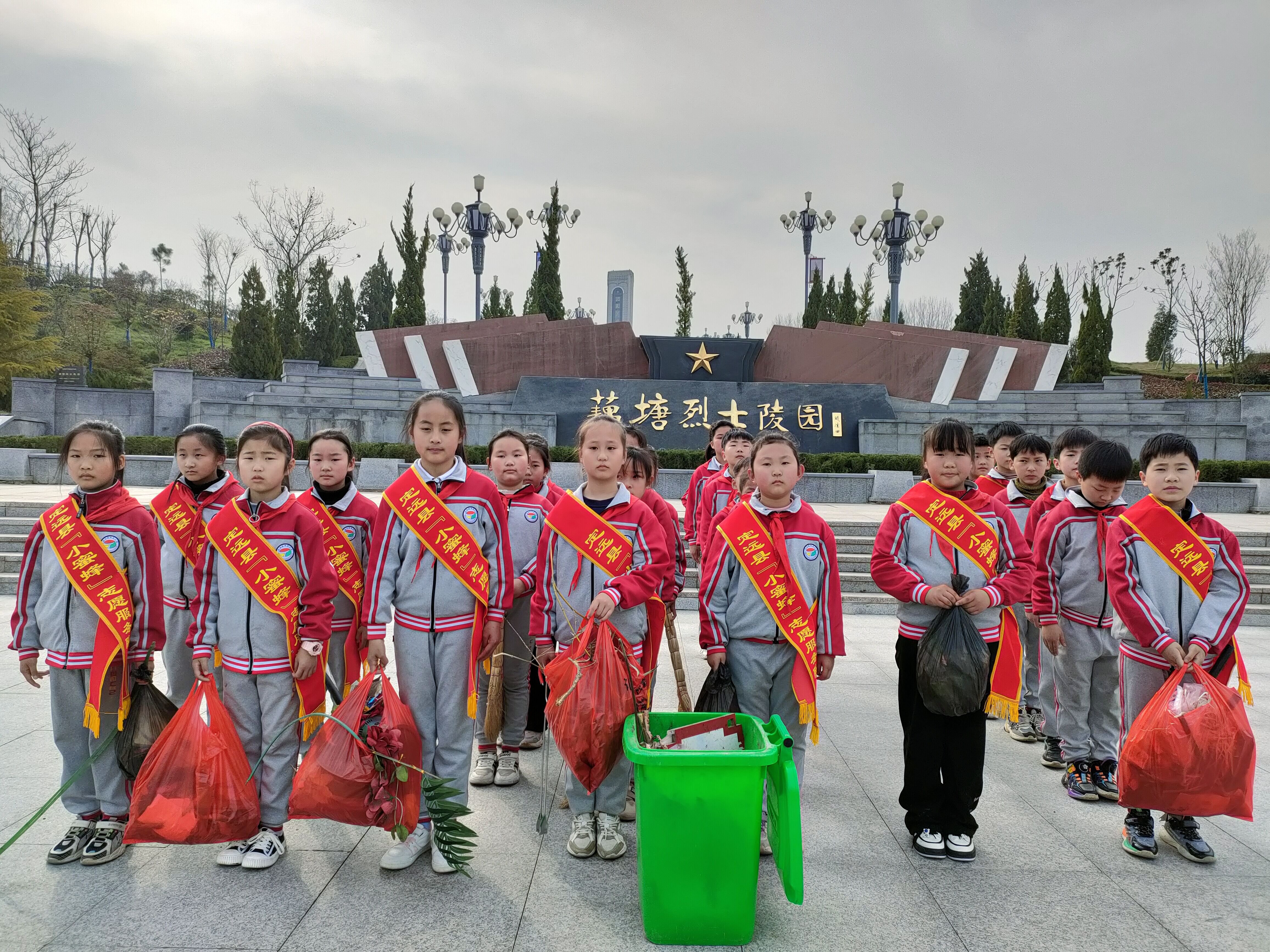 ~ 清晨,在大队辅导员的带领下,大家一路高唱队歌,奔赴藕塘烈士陵园,开展以清扫陵园周边环境为内容的志愿服务。各小组划分区域,分工协作,积极发扬不怕苦、不怕脏、不怕累的团结精神,一丝不苟地清扫路面垃圾、清理绿化带里的枯枝败叶、纸屑和塑料包装袋。大家个个干劲十足,有条不紊完成了本次实践活动,用实际行动诠释了雷锋精神的真正含义。