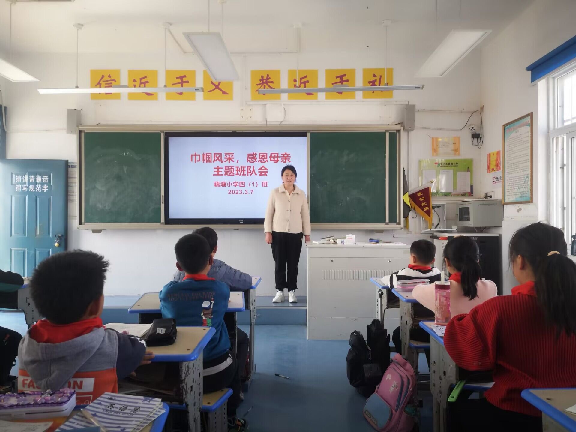 ~ 升旗仪式上,副校长於金国作国旗下讲话,他对各位女职工对待工作的高度责任感和无私奉献精神给予了充分肯定,并祝愿全体女职工们身体健康,节日快乐。接着,於金国发起“三八”妇女节感恩活动倡议,教育全体少先队员不仅要有感恩之心,更要付诸行动,为妈妈等女性长辈献上自己的爱心。在主题队会上,各中队辅导员向少先队员发出倡议,节日期间,在班级开展主题手抄报比赛,在家里替妈妈等女性长辈分担家务劳动:给妈妈洗洗脚,唱唱歌,说说心里话,亲手制作一份节日贺卡,给奶奶外婆捶捶背、泡杯热茶……
