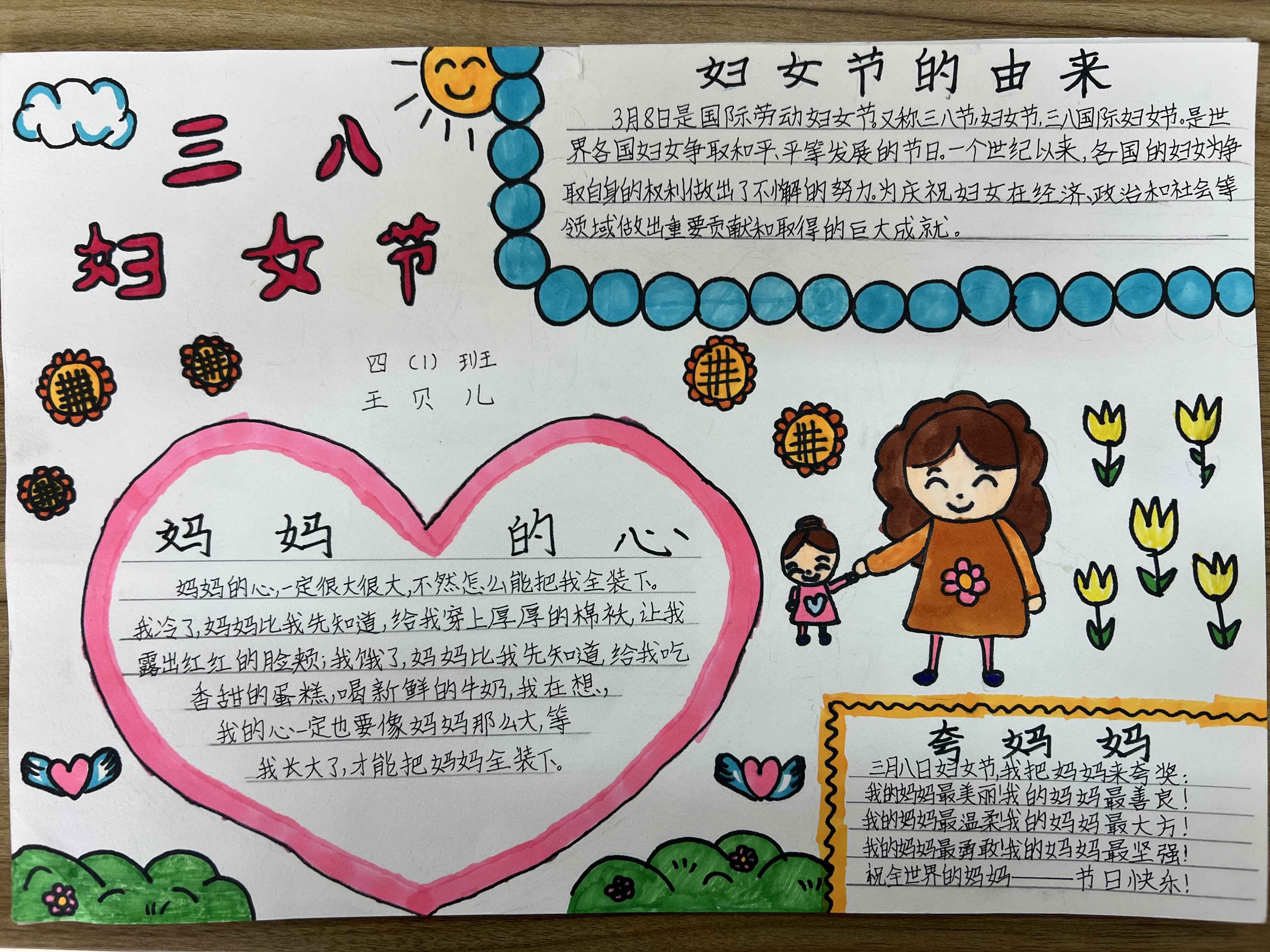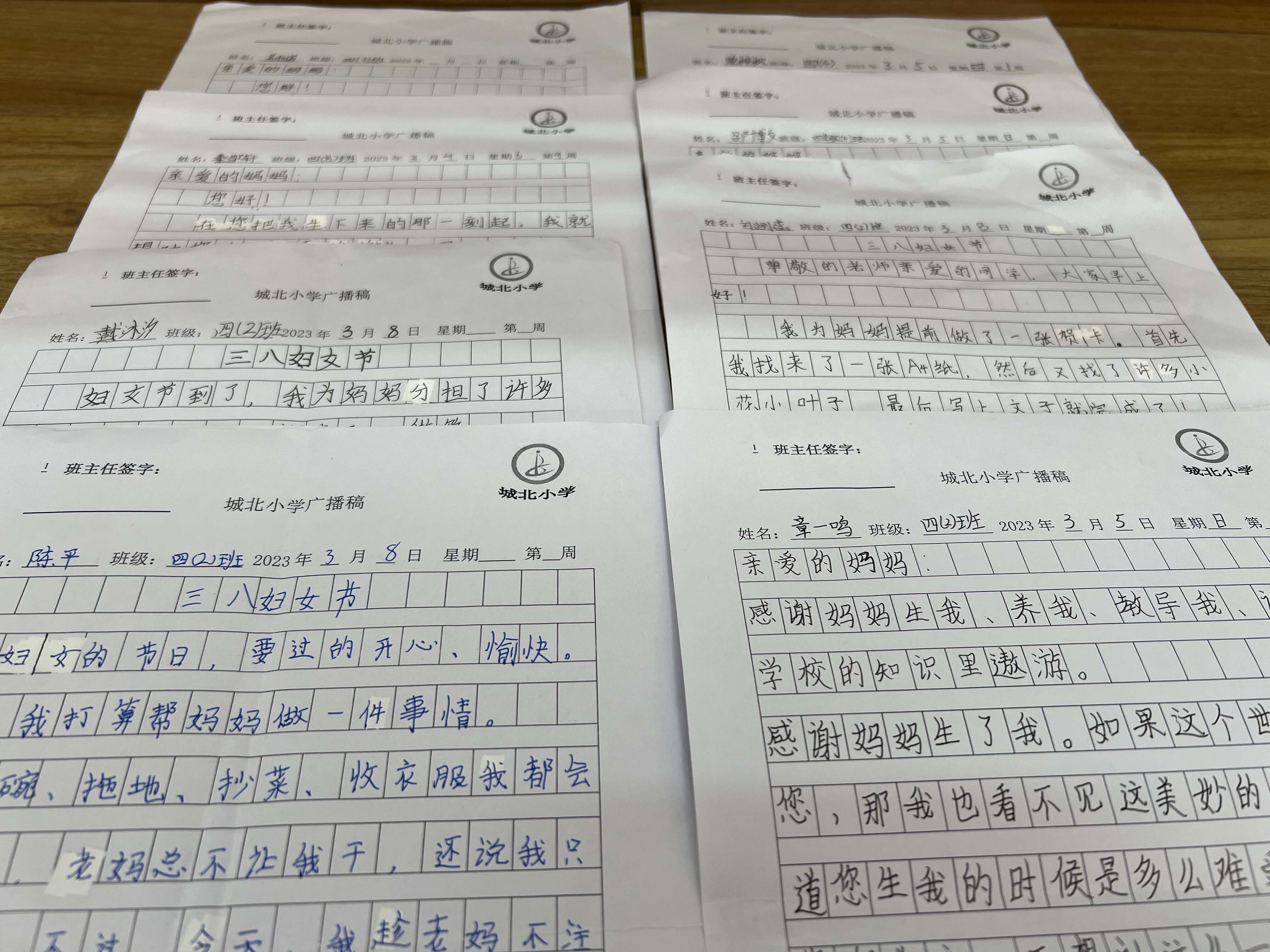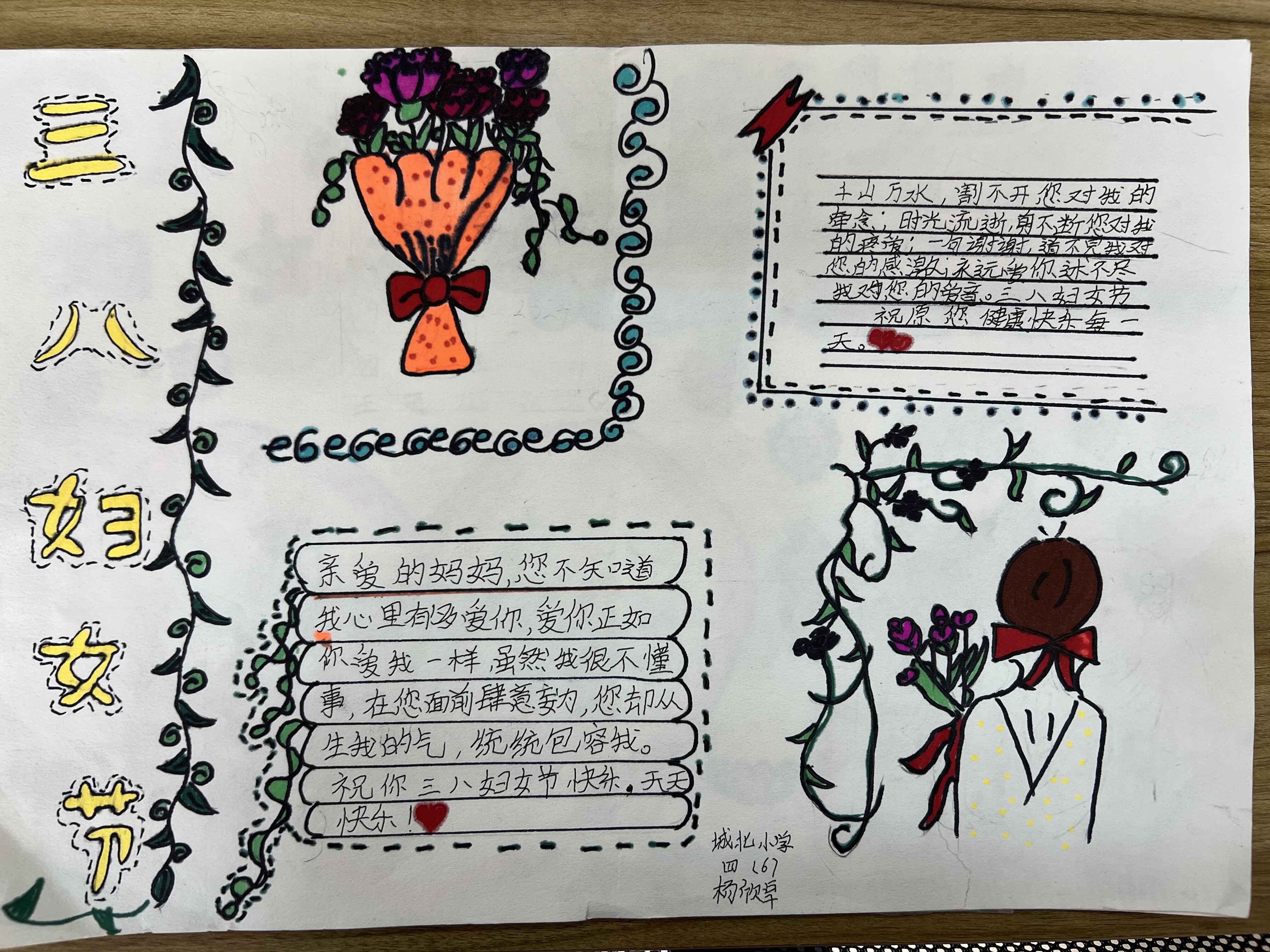 城北小学少先大队向全体少先队员发出倡仪,通过写给妈妈和老师的一封信、制作贺卡、帮妈妈做家务、三八妇女节手抄报、留守儿童给妈妈拨一个电话等形式,来表达队员们对老师和家长节日的祝贺。活动中,队员们热情高涨,积极参与,通过不同方式,纷纷表达对老师和妈妈的爱。