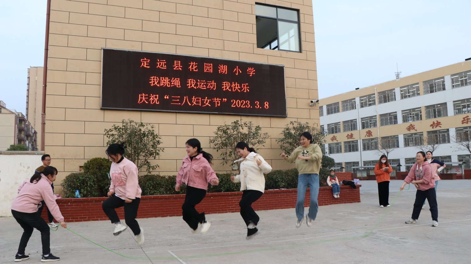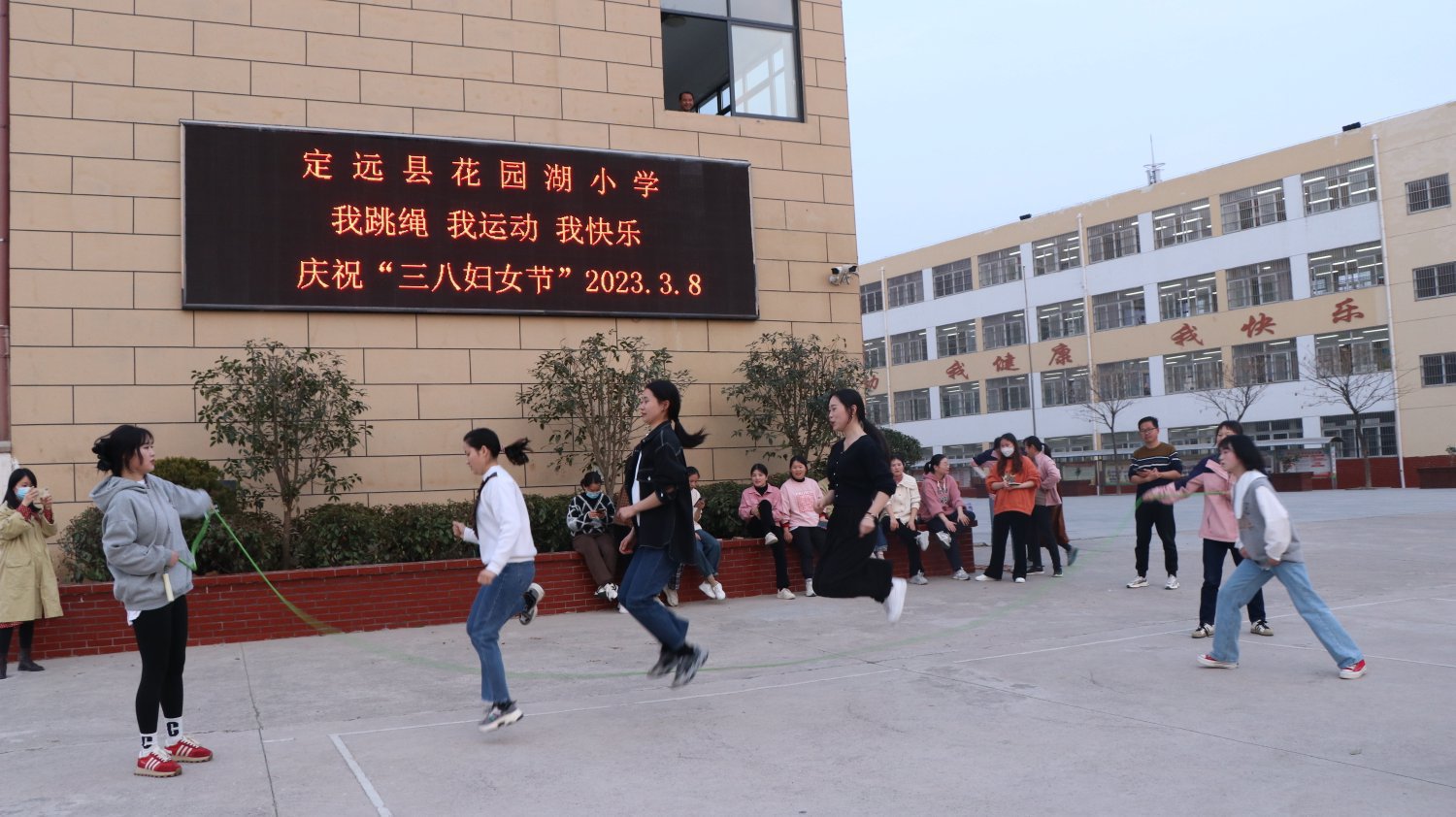 ~ 为提升女教师的幸福感,增强身体素质,发扬女士们的拼搏精神,让女性魅力在三月的春风里随梦想一起飞翔,3月8日下午,定远县花园湖小学工会组织了庆祝“三八”妇女节跳绳比赛活动。