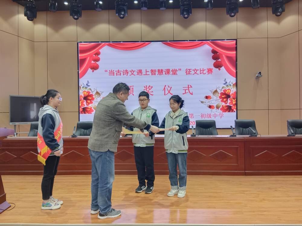 ~ 3月9日,定远县第一初中教育集团在双塘中学校区报告厅举行了“当古诗文遇上智慧课堂”为主题的征文比赛颁奖仪式。集团分管领导为获奖选手颁奖,并鼓励同学们再接再厉,积极参加学校举办的各项活动,进一步提高自己的综合素质。