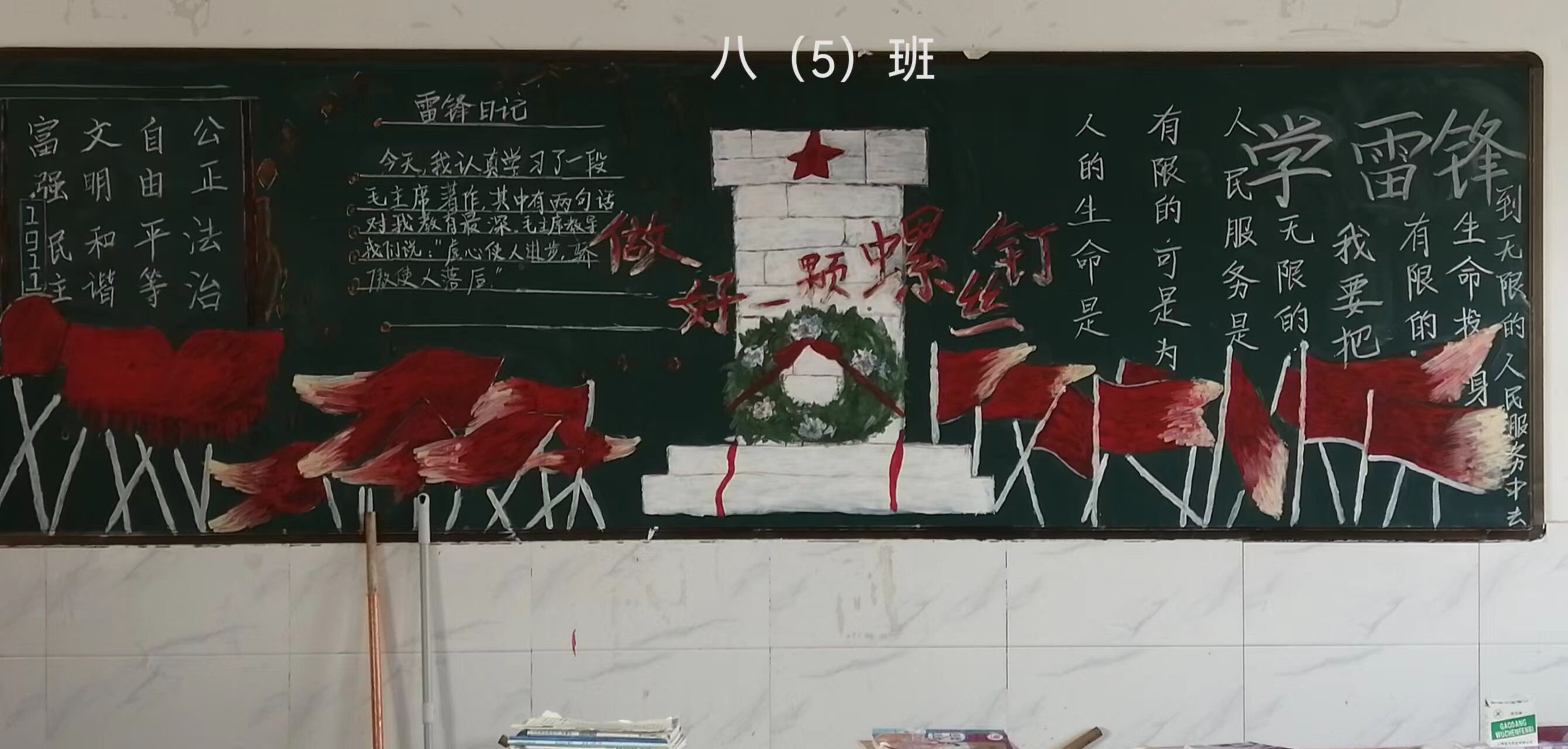 ~ 活动中,学校先后利用升旗仪式国旗下讲话、校园广播、电子屏、板报、主题班会等形式,介绍雷锋生平事迹,教育引导学生学习雷锋助人为乐、无私奉献、勤俭节约、热爱集体、严于律己的精神以及奋进求实的钉子精神。此外,团员青年在“学雷锋,创文明校园”主题团日活动中,积极主动清扫校园各个角落,清洁校园宣传栏,捡拾地面垃圾纸屑,营造了整洁优美的校园环境。团员青年以实际行动践行雷锋精神,引导全校学生自觉参与到文明校园创建活动中,人人争当校园文明使者,在奉献中绽放青春光彩。“作为新时代的青少年,我们要自觉做良好社会道德风尚的创造者和传播者,让雷锋精神在新时代绽放璀璨光芒”团员青年纷纷感言。(图文:刘国兵 李云 审核:柏传文)