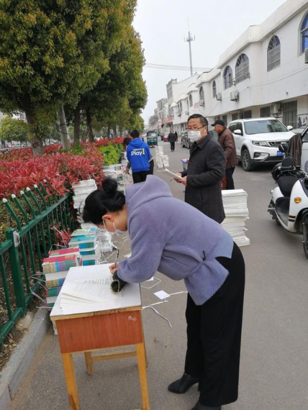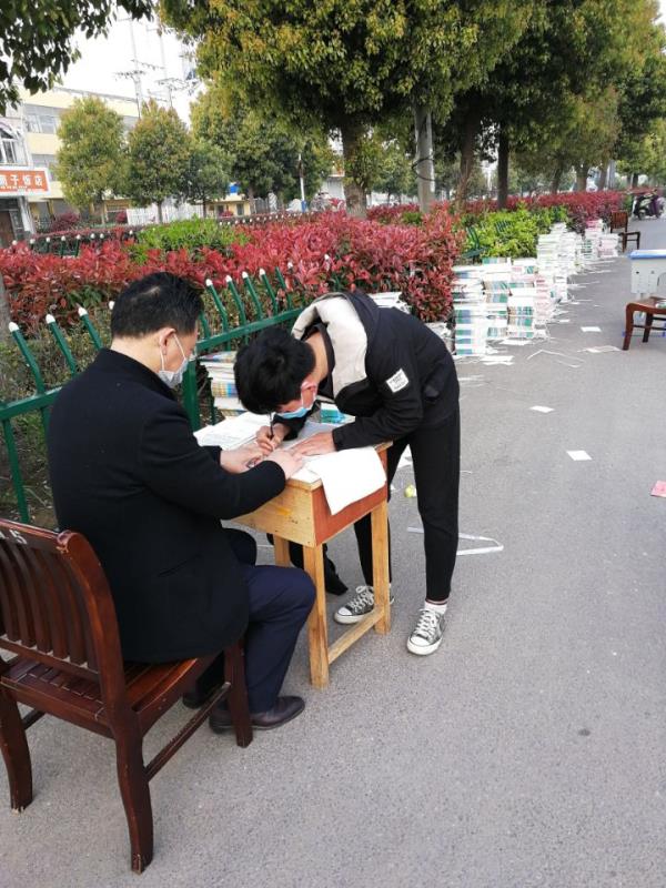 教材发放前,学校总务对教材进行彻底消毒、分类。各年级班主任早早赶到学校,按方案要求,提前把课本运到学校大门口外事先划定区域。按照防疫要求,七点半准时开始分时段分批发放教材。为了防止家长聚集,每个班级家长严格按规定时间快速签字领取课本,每班15分钟。在领取过程中,家长要佩戴口罩,排队依次等候,前后间隔要求1米以上,家长领取教材后立即离开,避免直接接触。对于因特殊原因未来领取课本的家长,由班主任代为领取,采取送书上门的办法,确保让每一位学生当天尽可能用上纸质课本。