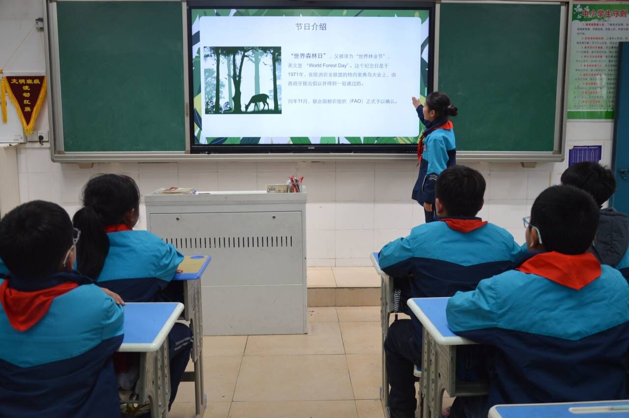 ~ 活动中,各班主任利用班班通和多媒体设备向同学们介绍了世界森林日的来历、森林的作用、世界森林分布等情况,重点就森林与气候的关系,建设森林、提高森林覆盖率、提高绿化覆盖率对城市发展的重要性与同学们进行了面对面的交流分享。学校还通过宣传大屏向同学们播放保护森林宣传视频来发出倡议,要求同学们从自己做起,从身边的小事做起,节约每一张纸,积极参加植树造林活动,爱护校园中的一草一木,用自己的实际行动为家园添绿,为地球增色。