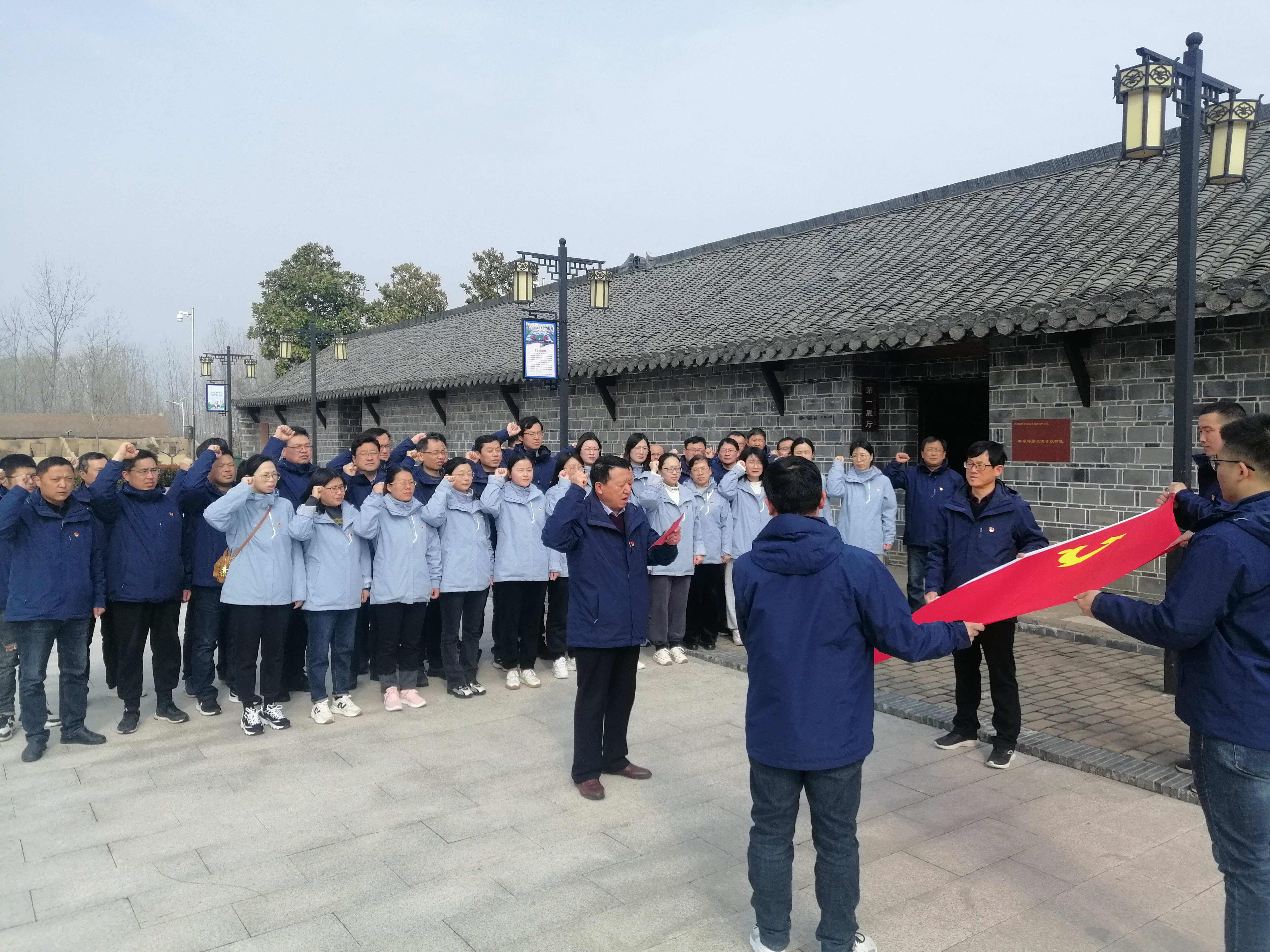 ~ 中原局会议纪念馆基本按旧址原状重建,主体为清一色的青砖小瓦徽派建筑。青砖灰瓦前,定远中学党委副书记张伦华同志带领全体党员重温入党誓词,在鲜红的党旗下,全体党员面向党旗,高举右手,紧握拳头,许下铮铮誓言。铿锵有力、掷地有声的宣誓声久久回荡,彰显着定远中学党员同志追随党的忠心和献身党的决心,大家在重温入党誓词中坚定自己对党的忠诚信念。