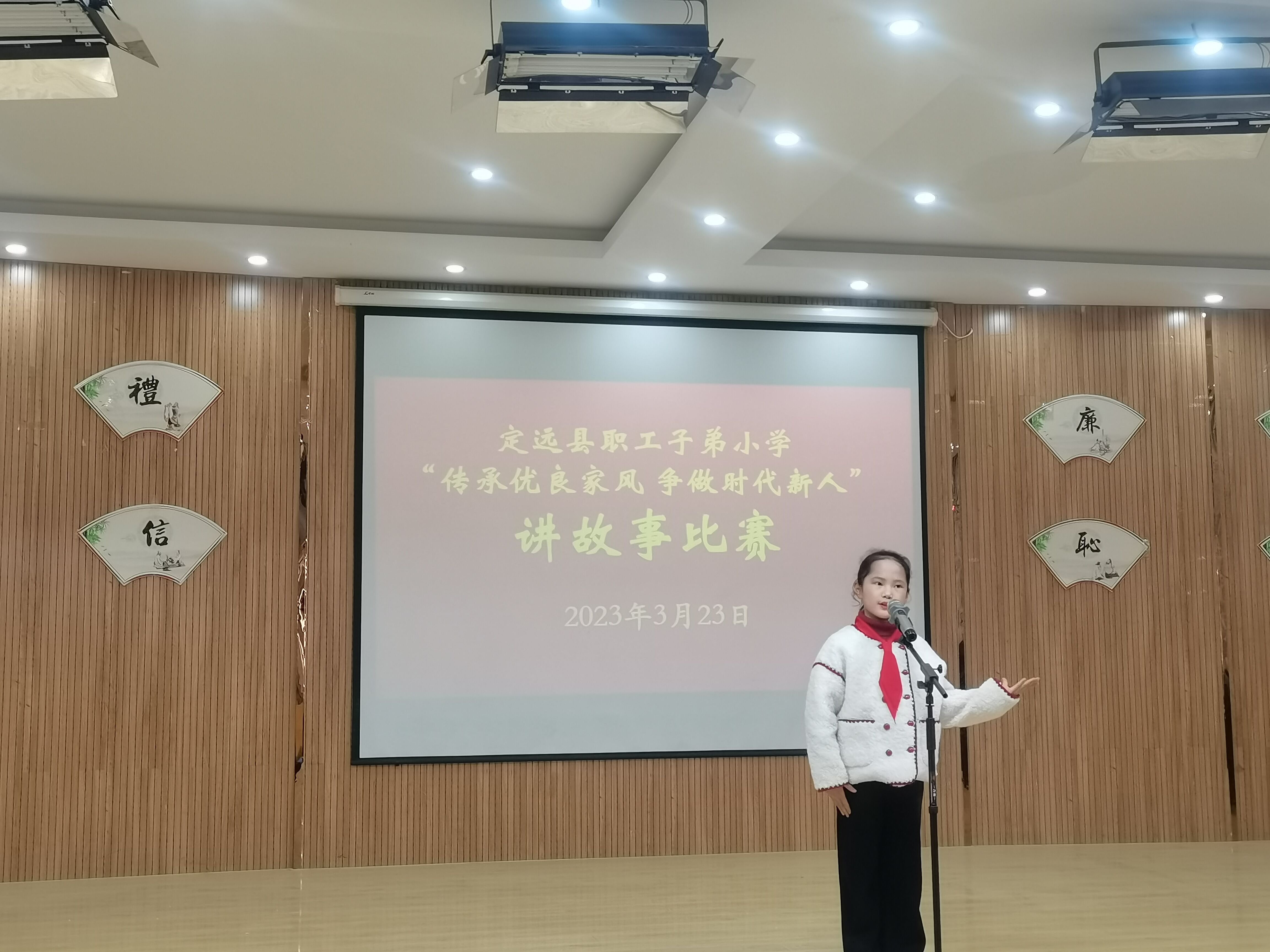 ~ 为深入学习贯彻党的二十大精神,加强爱国主义教育,进一步丰富学生精神文化生活,营造传承优秀家风的良好氛围,3月22日下午开始,定远县职工子弟小学在四楼多功能教室举办了“传承优良家风 争做时代新人”讲故事比赛。
