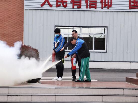 尹警官向师生和家长演示灭火器使用方法并且指导学生操作,并通过消防安全知识培训讲座向师生和家长们讲授出现火灾安全事故时正确处置方法。
