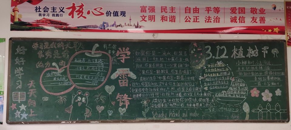 ~ 各班通过主题班会和黑板报学习雷锋故事,了解雷锋精神;学习植树节相关知识,了解环保的重要性。认识到现在的绿水青山就是将来的金山银山,美好生活不能只有美丽环境、更要有美好心灵。