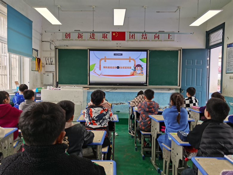 ~ 班会课上,班主任通过“问卷调查”、观看“PPT”让同学们探寻近视的原因。对平时近视问题的误区进行了引导,最后规范了孩子们眼睛保健操的姿势和动作,通过形象生动的动画使学生掌握了科学用眼的常识,通过朗朗上口的“爱眼 护眼”歌,让他们牢记护眼知识,拥有明亮的眼睛,才能拥抱世界的光明。