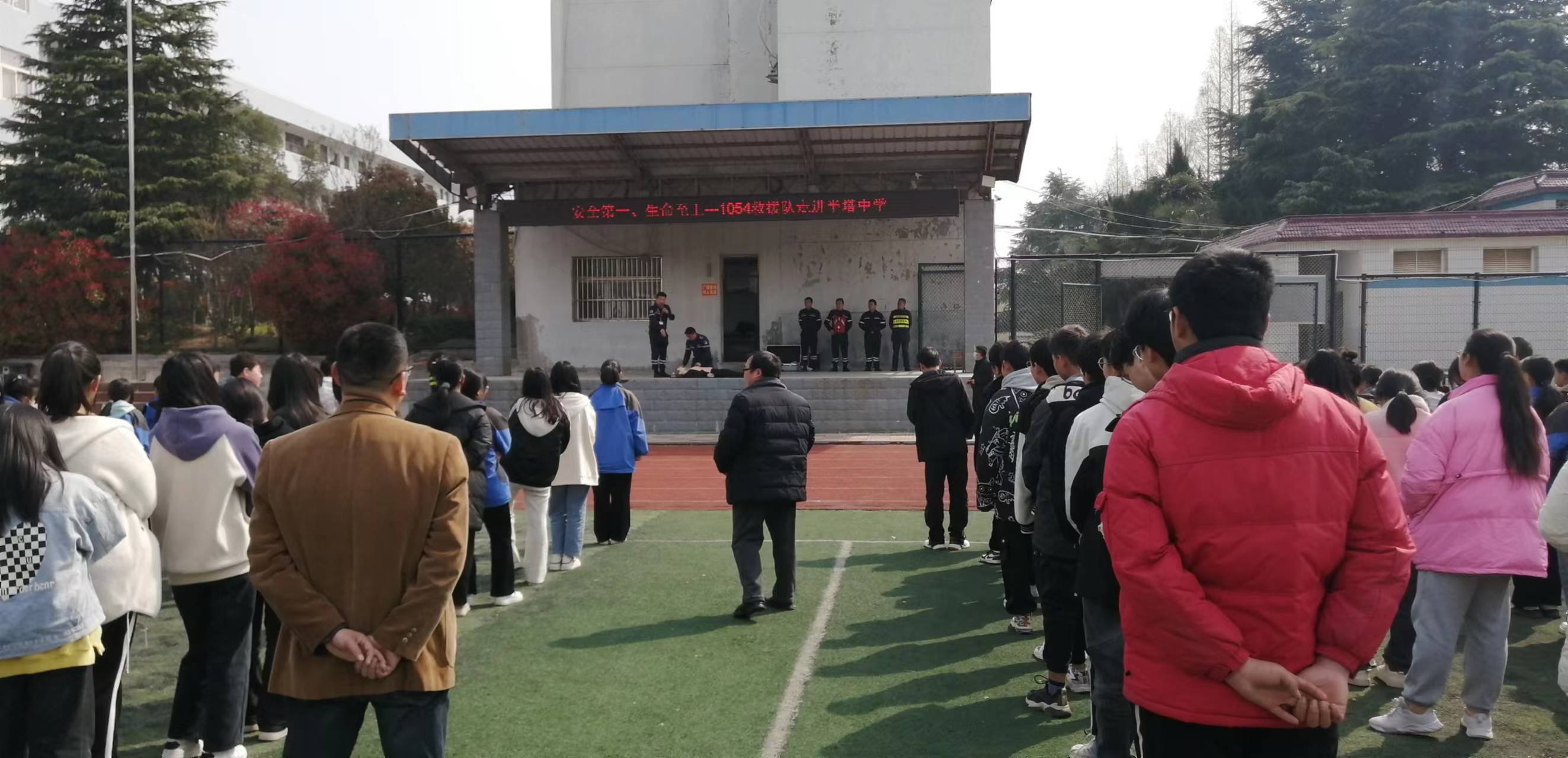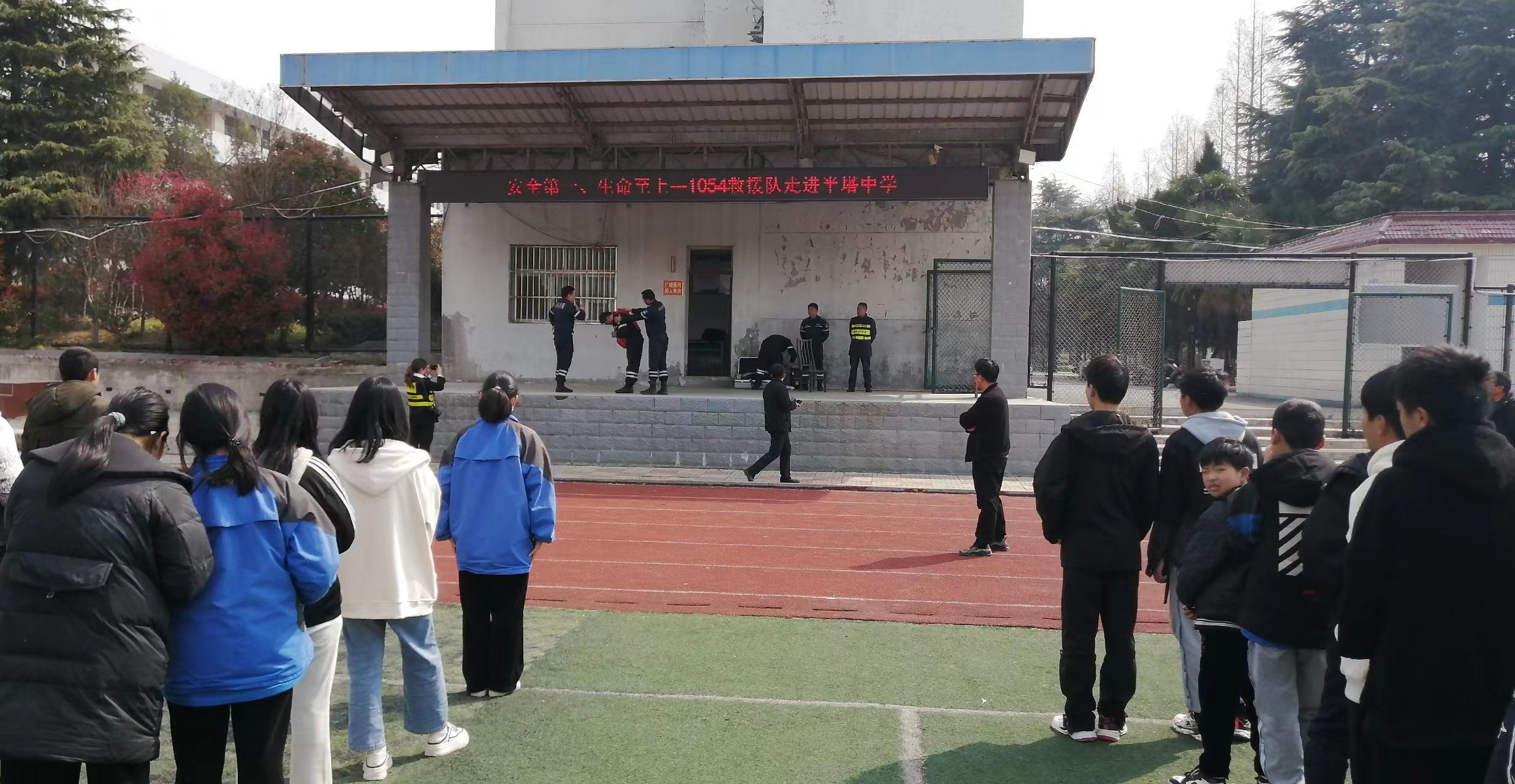 ~ 面对操场上肃立整齐的五百多名学生和老师,救援队宣讲师冯立捷用洪亮的声音加上队友施救动作演示,向同学们作了以下四个方面知识宣讲。