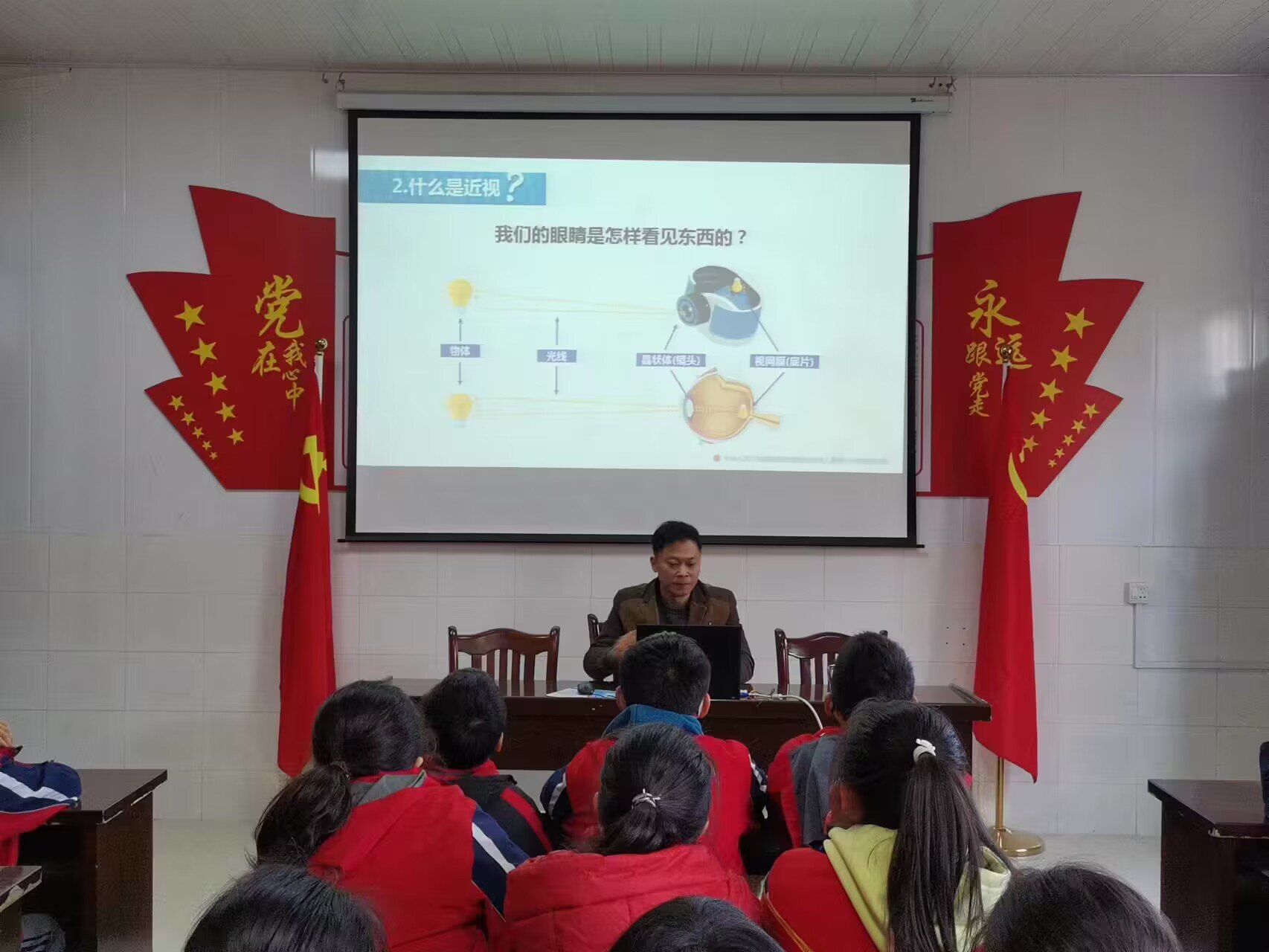 科普讲座现场,陈东亮针对小学生群体普遍存在的用眼习惯问题,从近视的形成原因开始分析,以广大小学生日常生活中的不良用眼习惯为切入点,从认识近视、了解近视再到预防近视,为现场学生阐明了近视防控的初步概念。