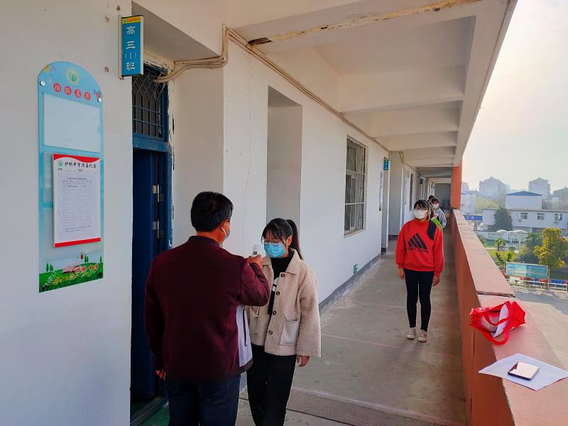 根据返校工作方案,学生早晨7:30进校,在大门口按前后相隔1.5米左右的次序排队进行体温测试。简单的返校,却和以往有太多的不同,严格、严谨、严肃,一丝不苟。体温正常的学生进班,由班主任进行二次测温。在校门口测温时,若有体温出现异常的,将立即启动应急处置预案,值班老师带到应急观察点进行二次测温。 为了确保炉桥中学高三安全有序返校复学,县教体工委包保领导韩宪国副书记、徐大山主任早早来到学校现场,校党委书记、校长孙凯亲自指挥,驻守医护人员现场指导防疫工作,炉桥派出所派出警员负责入学秩序,学校各工作人员分工合作,各司其职。