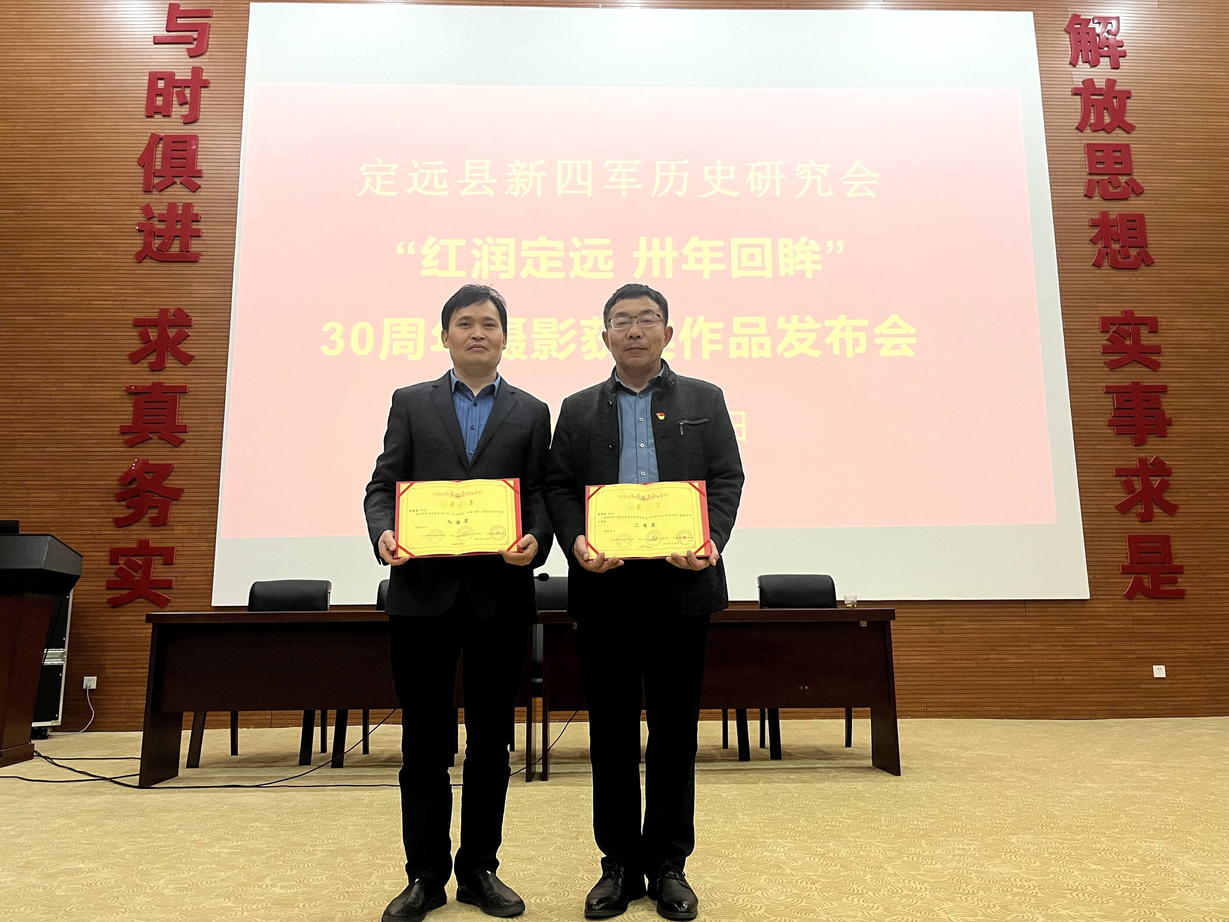 ~ 参观结束后,在藕塘烈士陵园纪念馆会议厅举办了“红润定远卅年回眸”30周年摄影获奖作品发布仪式。定远县新四军历史研究会成立于1992年,2022年为了纪念研究会成立30周年,研究会主办了“红润定远 卅年回眸”摄影征集活动。此次活动共收到作品290幅,经专家评审,6幅作品分获一二三等奖,47幅作品获入围奖。发布会颁发了获奖证书,赠送了摄影作品集。摄影作品既从大视野展示了时代变迁,也从小视角反映了社会新貌,让人直观地感受到时代的波澜、生活的巨变。同时描绘了定远儿女沿着红色历史的足迹,继往开来、接续奋斗,矢志不移奋进新征程、建设新时代的美丽画卷。(张磊)