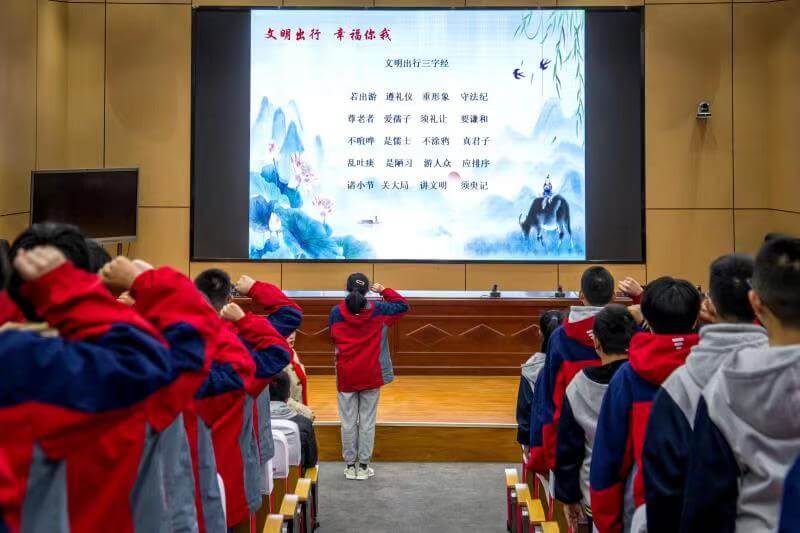 ~ 活动中,市新时代好少年、市最美军娃,双塘中学校区八(7)班班长刘译聪同学带领大家宣誓,并集体诵读文明出行三字经。参赛同学们佩戴着鲜艳的红领巾,动情地朗诵诗歌,讲述英雄烈士事迹,通过红色故事走进历史,铭记英雄,用稚嫩的声音宣扬中华优秀传统文化、抒发家国情怀。《红色中国》让师生回顾了中国发展历程;《七律·长征》让学生感受到了红军不怕艰难险阻的大无畏精神;《我骄傲,我是中国人》、《祖国啊我亲爱的祖国》激起了学生爱国情;《沁园春·雪》令学生感受到祖国壮丽河山的美丽……一篇篇不朽的红色经典作品呈现在我们面前。主题鲜明、深刻,格调积极向上,语言自然流畅,富有真情实感。集团团委副书记、少先队大队辅导员刘晓燕老师寄语全体同学要传承中华民族优良传统和革命精神,汲取成长和历史的力量,为国家富强和民族振兴而接续奋斗!
