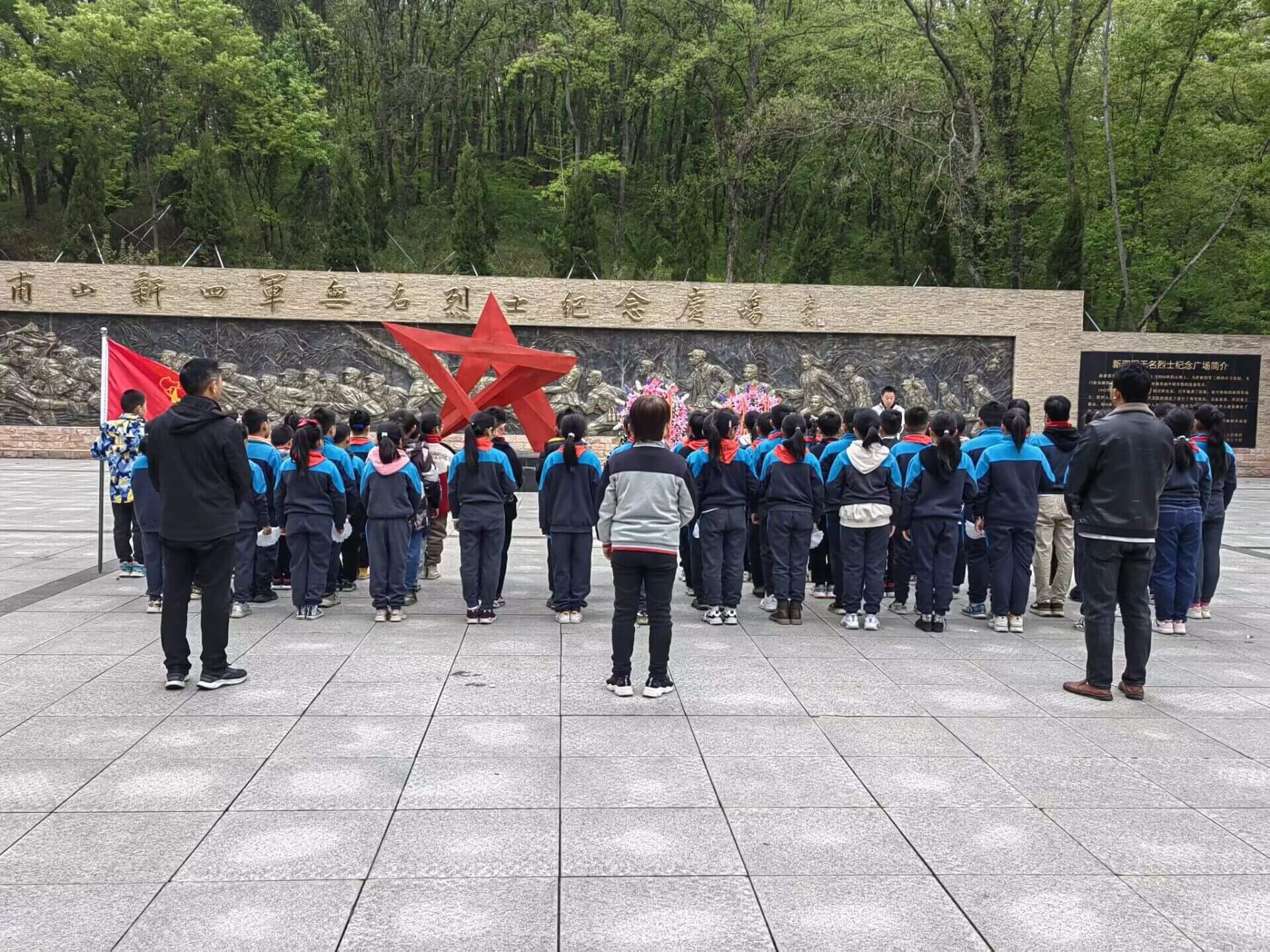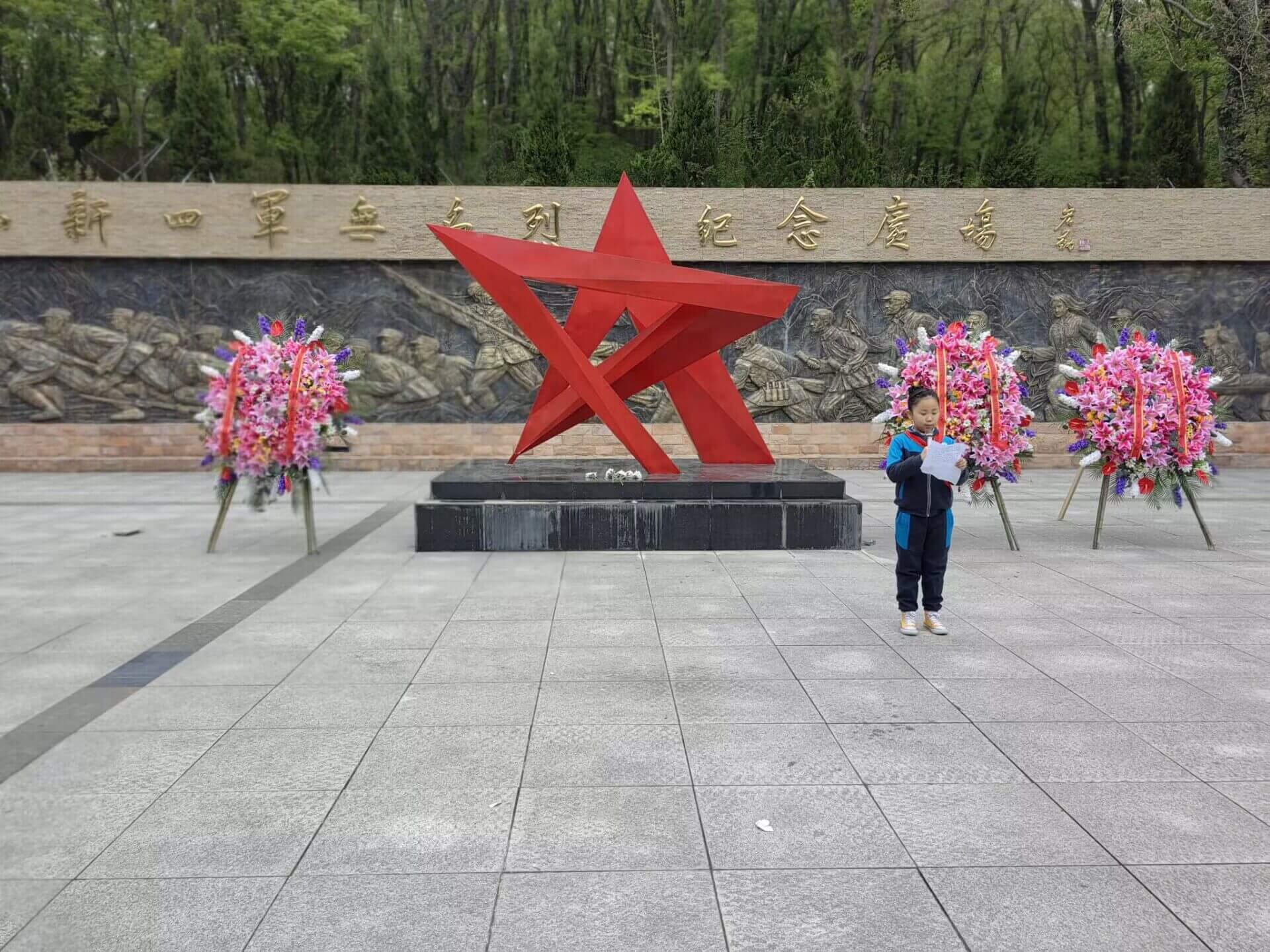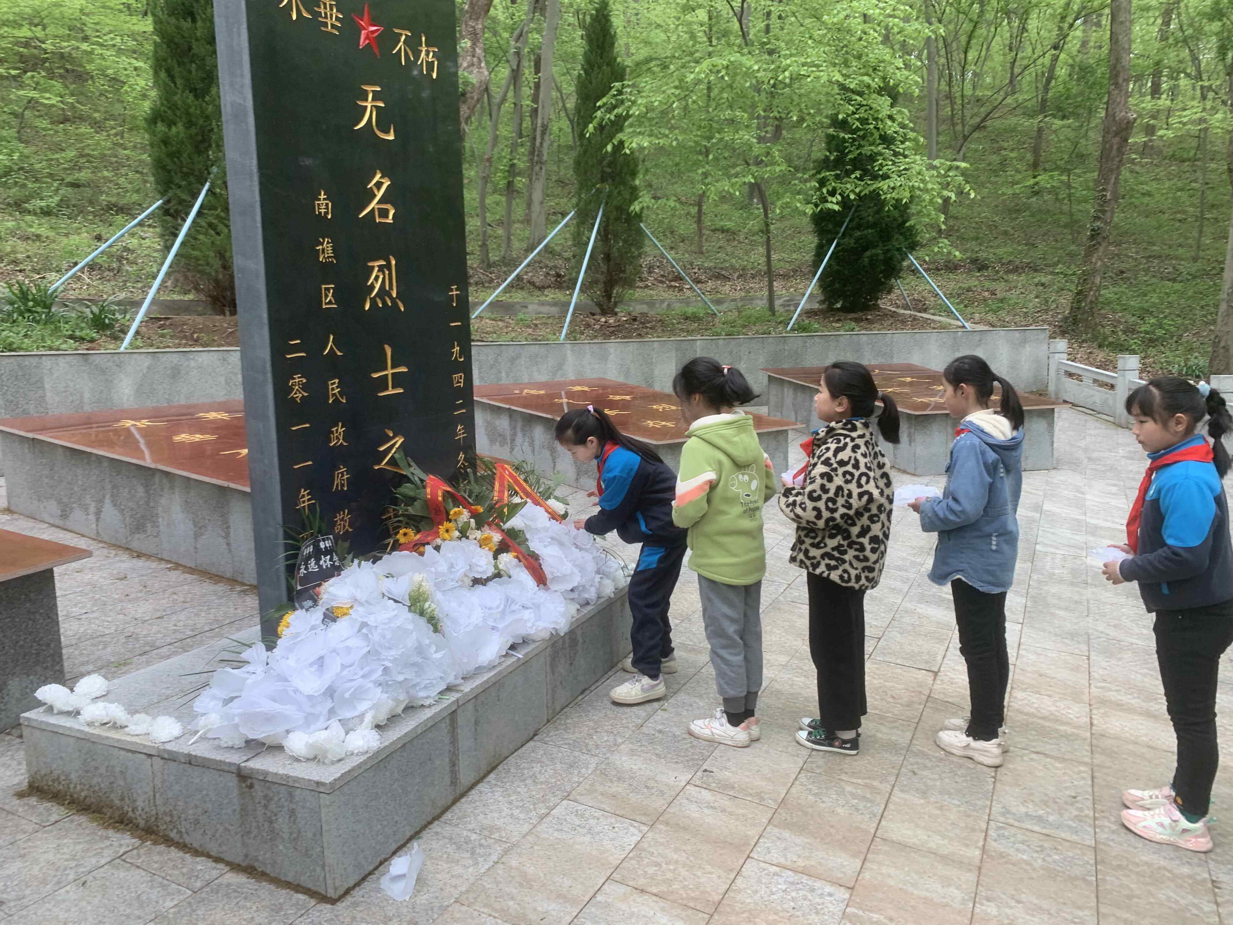 ~ 在皇甫山新四军无名烈士广场上,庄严的奏国歌仪式后,全体师生默哀一分钟,向革命先烈敬献花篮,全体师生三鞠躬表达对先烈的深切悼念之情。学生代表刘娅楠号召全体同学发扬革命先辈的光荣传统,牢记烈士们的光荣事迹,用优异的成绩回报学校,回报社会。最后学生前往无名烈士墓献上小白花表达对烈士的哀思。