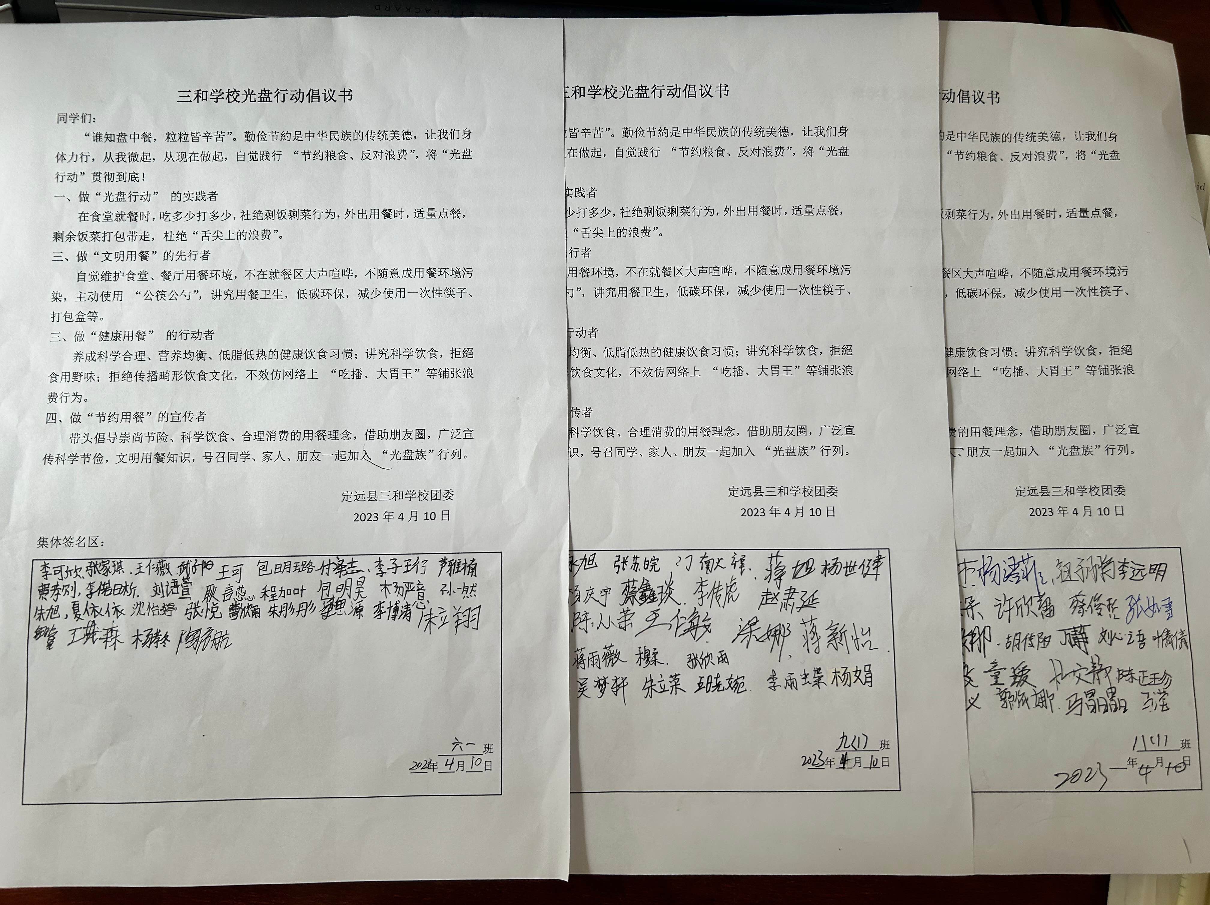 ~ 在分管负责人的统筹安排下,校团委以及各班主任精心组织,多措并举,开展了一系列形式多样的教育活动。4月10日,利用国旗下的讲话,八(1)班耿寒露同学以《做“光盘行动”的践行者》为题进行演讲,引起学生对本次活动的重视,进一步提高学生珍惜粮食的意识;同时,每班还安排两名学生作为光盘行动监督员,在食堂轮流负责就餐检查;下午,各班班主任利用班会时间召开了一节有针对性的班会,让全体学生都认识到,浪费粮食是可耻的;会后,全体学生在《三和学校“光盘行动”倡议书》上签上自己的名字,从此大家都是光盘行动的实践者,文明用餐的先行者,健康用餐的行动者,节约用餐的宣传者;此外,本次节约粮食教育活动中,学生们还将与“光盘”进行一次合影,选取部分照片贴于橱窗展示,旨在让大家以节约为荣,让节约成为一种时尚,让节粮成为一种习惯。