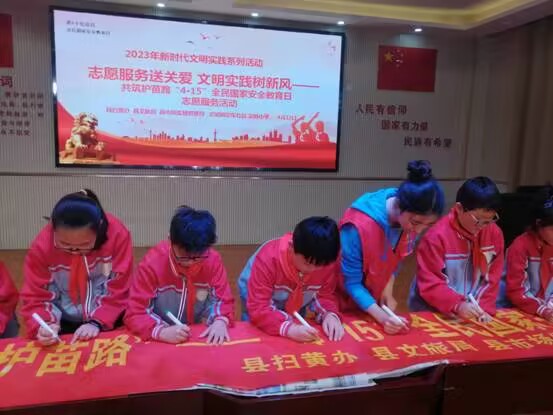 ~ 此次活动分为专题讲座和集体签名两个环节。志愿服务者提前在少先队员中发放了宣传手册。县文旅局文化执法大队曹伟随后作了题为《如何预防未成年人沉迷网络》专题讲座。讲座以当今信息化社会飞速发展入题,例举了部分中小学生沉迷网络的现象,剖析了网瘾的成因,介绍了网络沉迷的危害,就如何预防网络成瘾进行了具体指导。讲座中,曹伟讲解了“扫黄打非”的概念,展示了文旅局查处违法出版物,打击私自架设卫星接收天线等执法现场图片;介绍了文化主管部门为净化文化市场,在维护国家文化安全方面所做的具体工作,教育学生自觉抵制非法出版物,进一步提升文化安全意识,人人争做遵纪守法的新时代好少年,为自己的健康成长持续“加分”。定远县市场监督管理局刘传飞就食品、药品科普知识进行宣传。通过介绍鉴别“保健食品”真伪,购买“婴幼儿配方乳粉产品”注意事项,“特殊医学用途配方食品”的适用范围等知识,为维护学生“舌尖上的安全”提供了丰富知识储备,使全体学生有效增强了食品安全意识。在聆听完讲座后,参加活动的少先队员代表和志愿服务者们先后在主题横幅上有序签名。