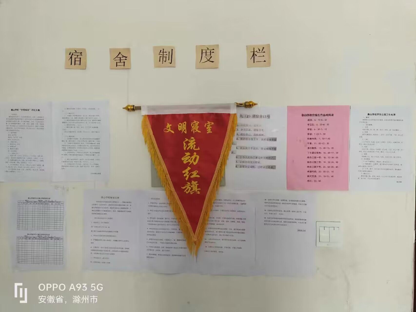 2023年3月23日, 校长室组织班主任对12个寝室进行了评比:从寝室文化、卫生、内务布置等方面进行评比检查。在深入细致的检查中,检查人员本着客观、公平、公正的原则,按照寝室内卫生标准及内务要求,对各寝室进行了打分,由陶贵主任最终核算,评选出了本月文明寝室。对于本次获奖的寝室,学校在周一的升旗仪式上进行了表彰,每个文明寝室发一个流动小红旗,一张文明寝室的奖状,被评为文明寝室的住校生每人发一本笔记本,以此激励。