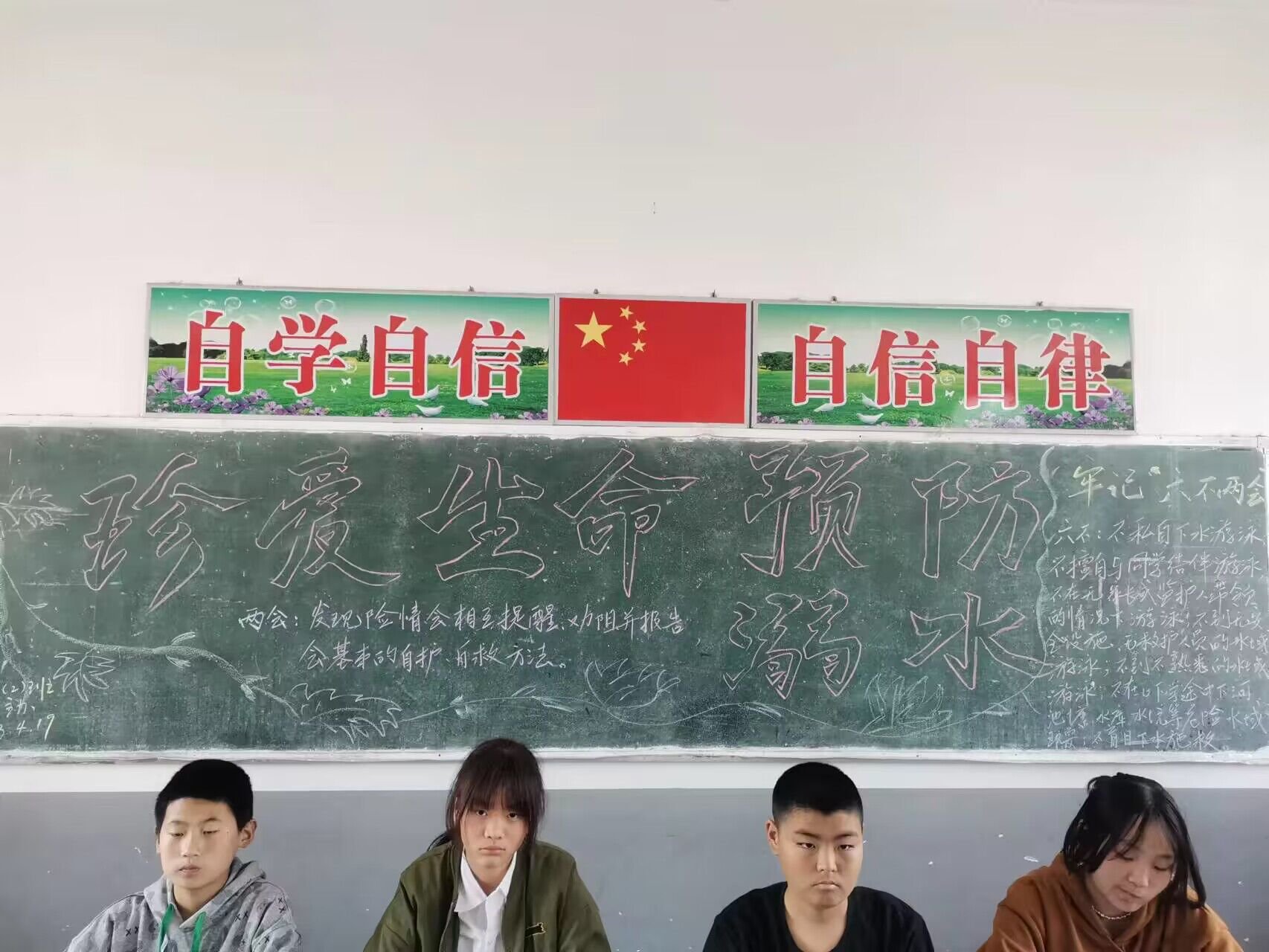 ~ 各班的板报紧紧围绕“珍爱生命 预防溺水”的主题,精心设计版面,精选内容,主题鲜明突出,形式多样,内容主要包括:防溺水“六不两会”、识别危险水域、自护自救的方法、同伴溺水怎么办、安全监管四知道、防溺水歌谣等。