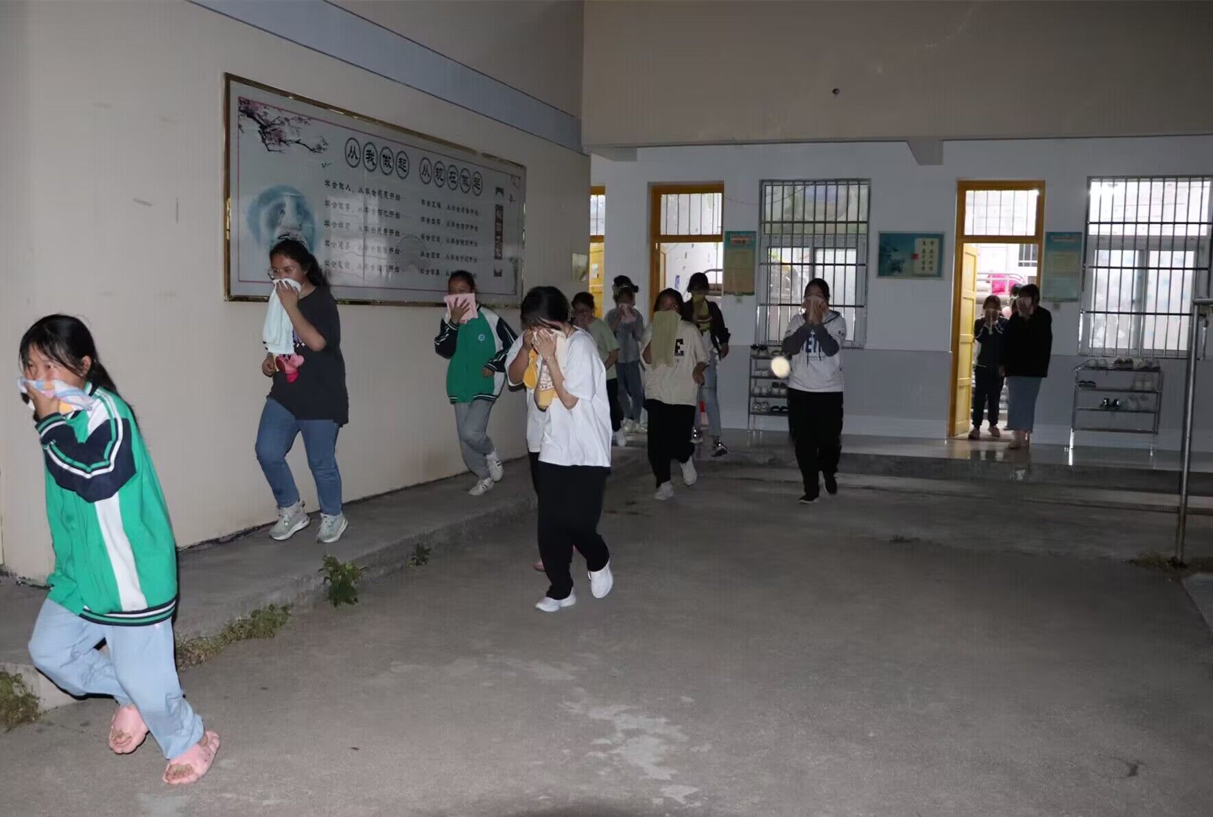 ~ 演练前,安全办主任对演练作了安排部署。随着哨声响起,宿舍区全体学生迅速用毛巾捂住自己的口鼻,弯着腰,紧张有序地从宿舍安全通道撤离到广场安全地带。